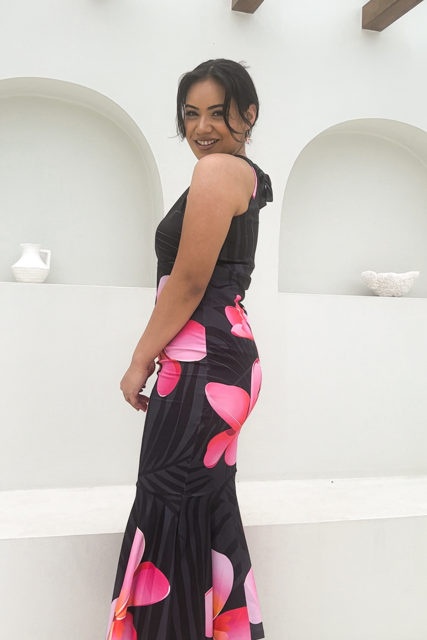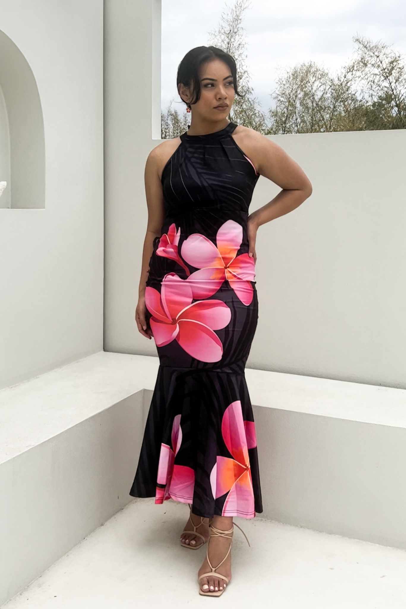 This show-stopper of a dress embraces the vibrant colours of the Pacific. With a tie at the back for the halter neck and flattering mermaid hem using breathable nylon fabric, this dress will have you looking gorgeous all day long.