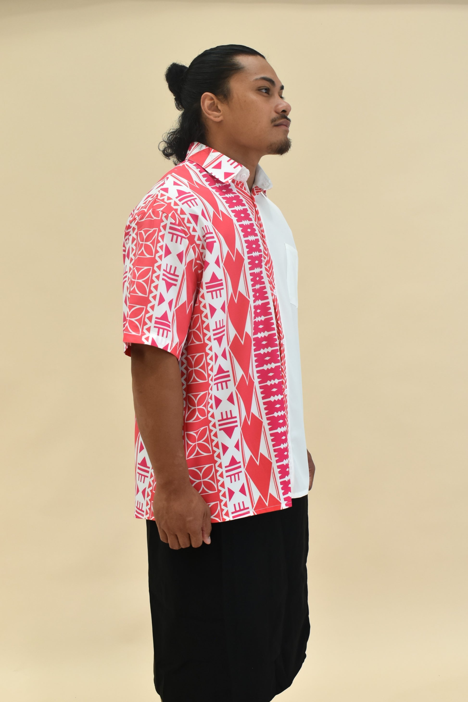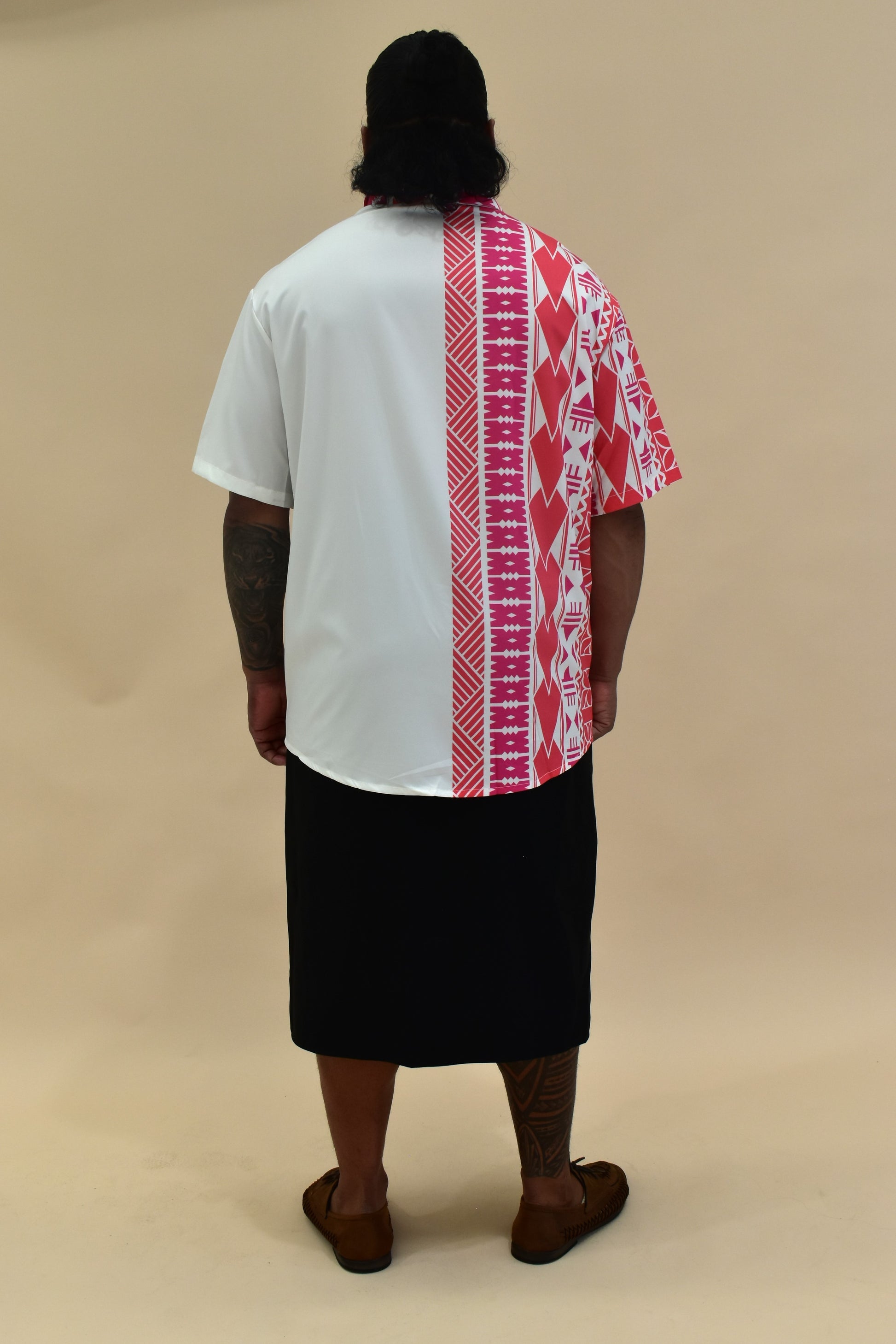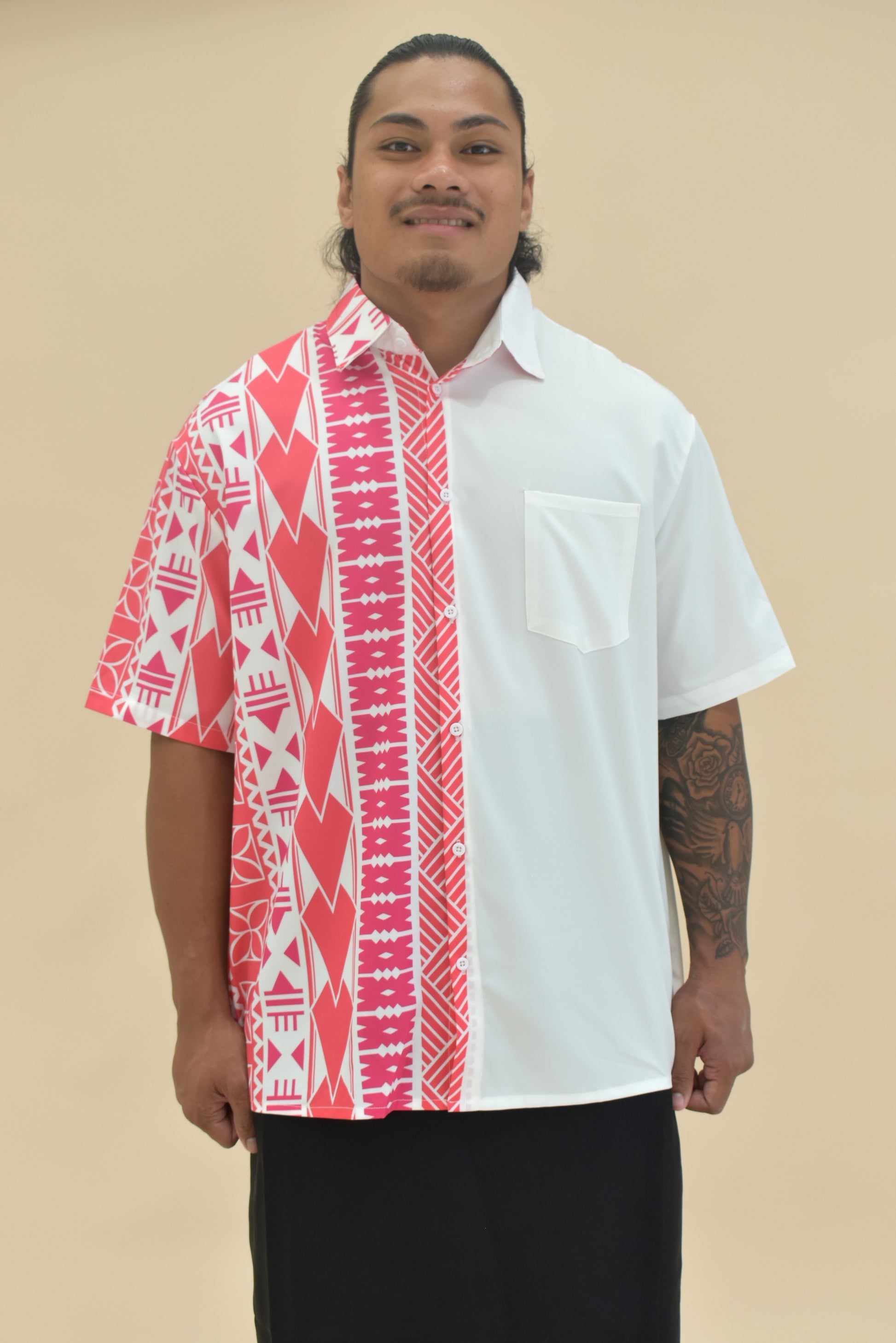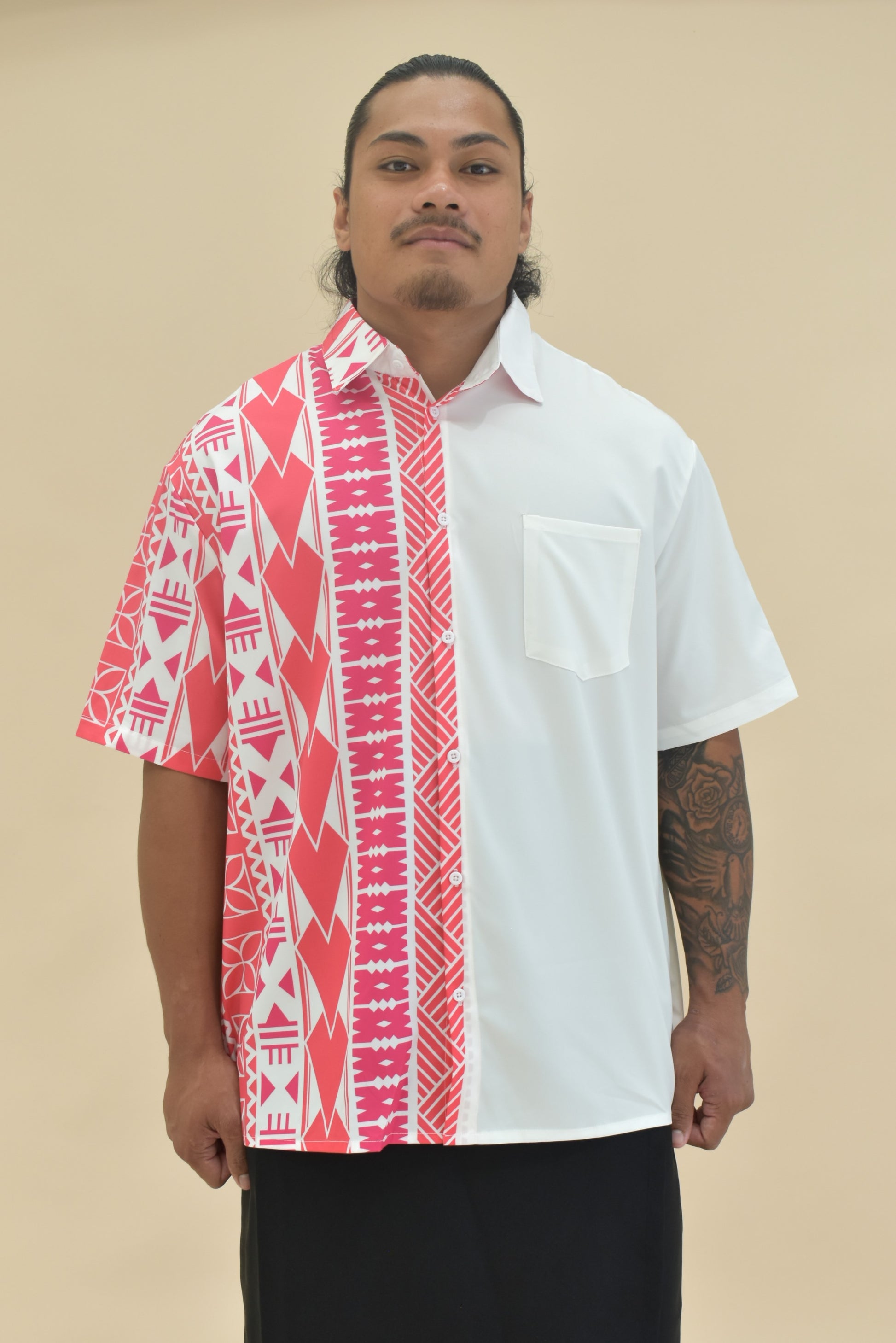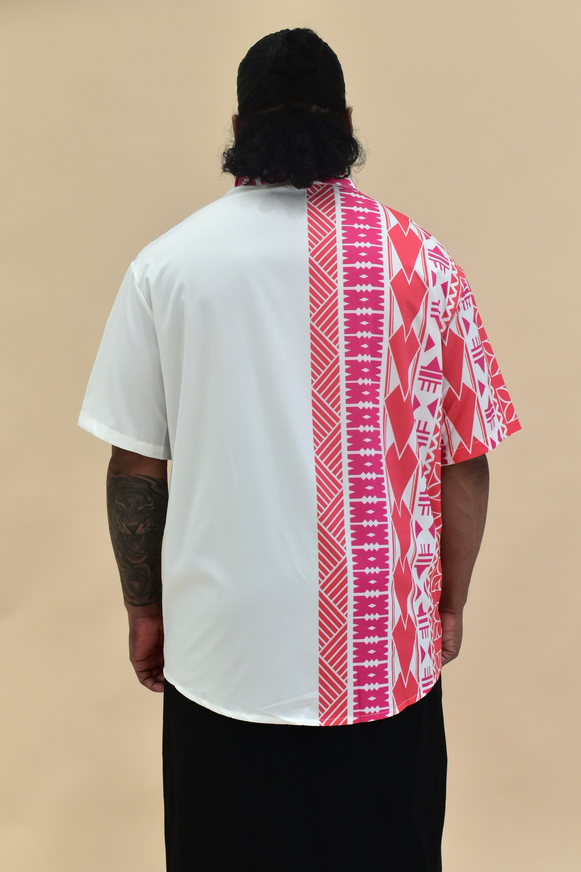 KALEI SHIRT - COLLARED BUTTON UP SHIRT - PINK & WHITE MELANESIAN PATTERN