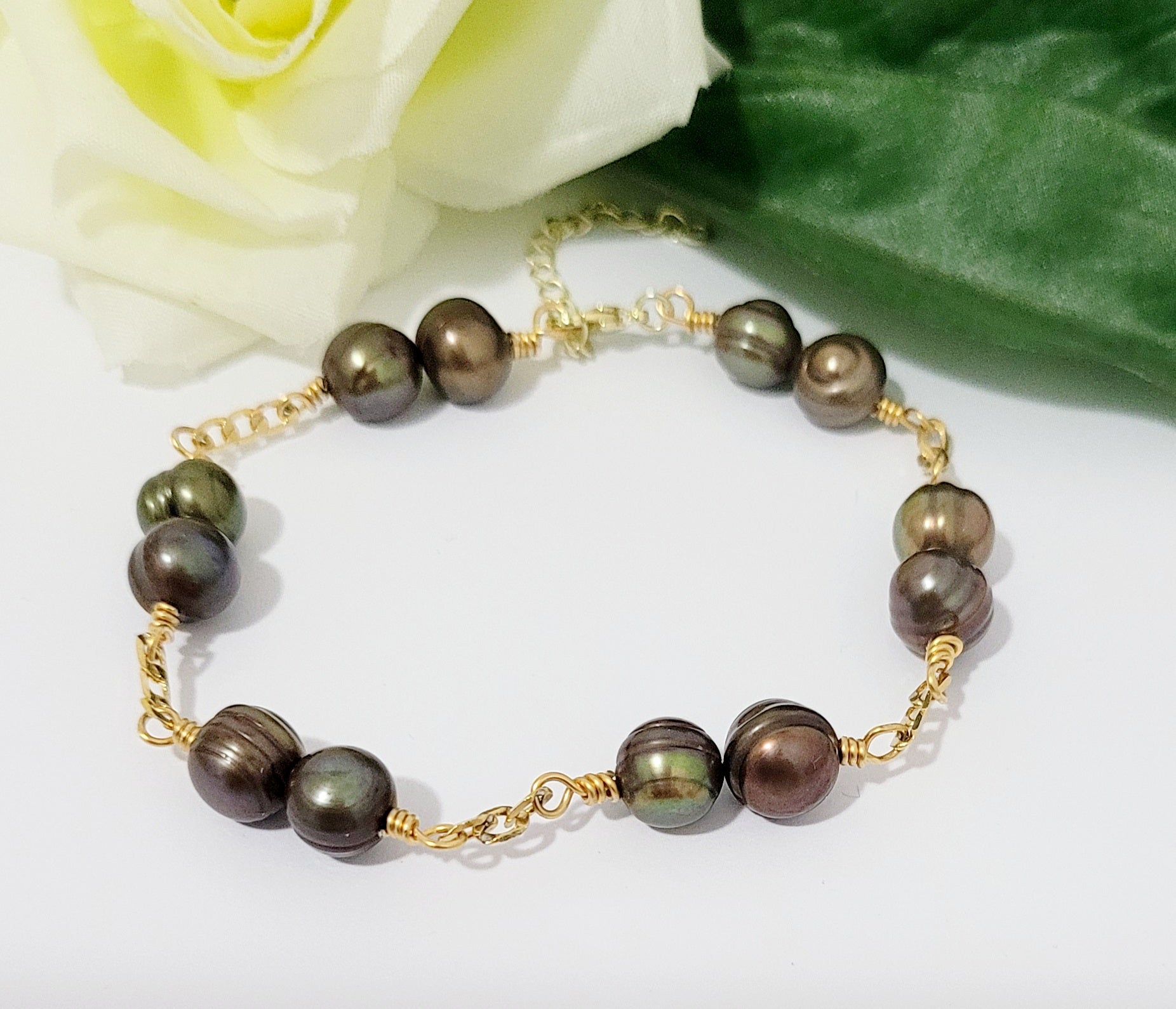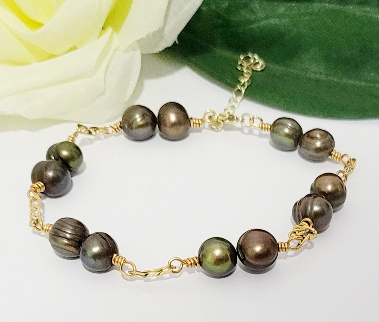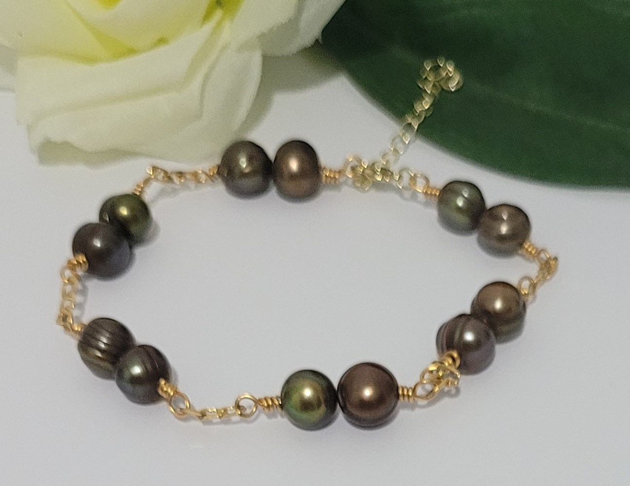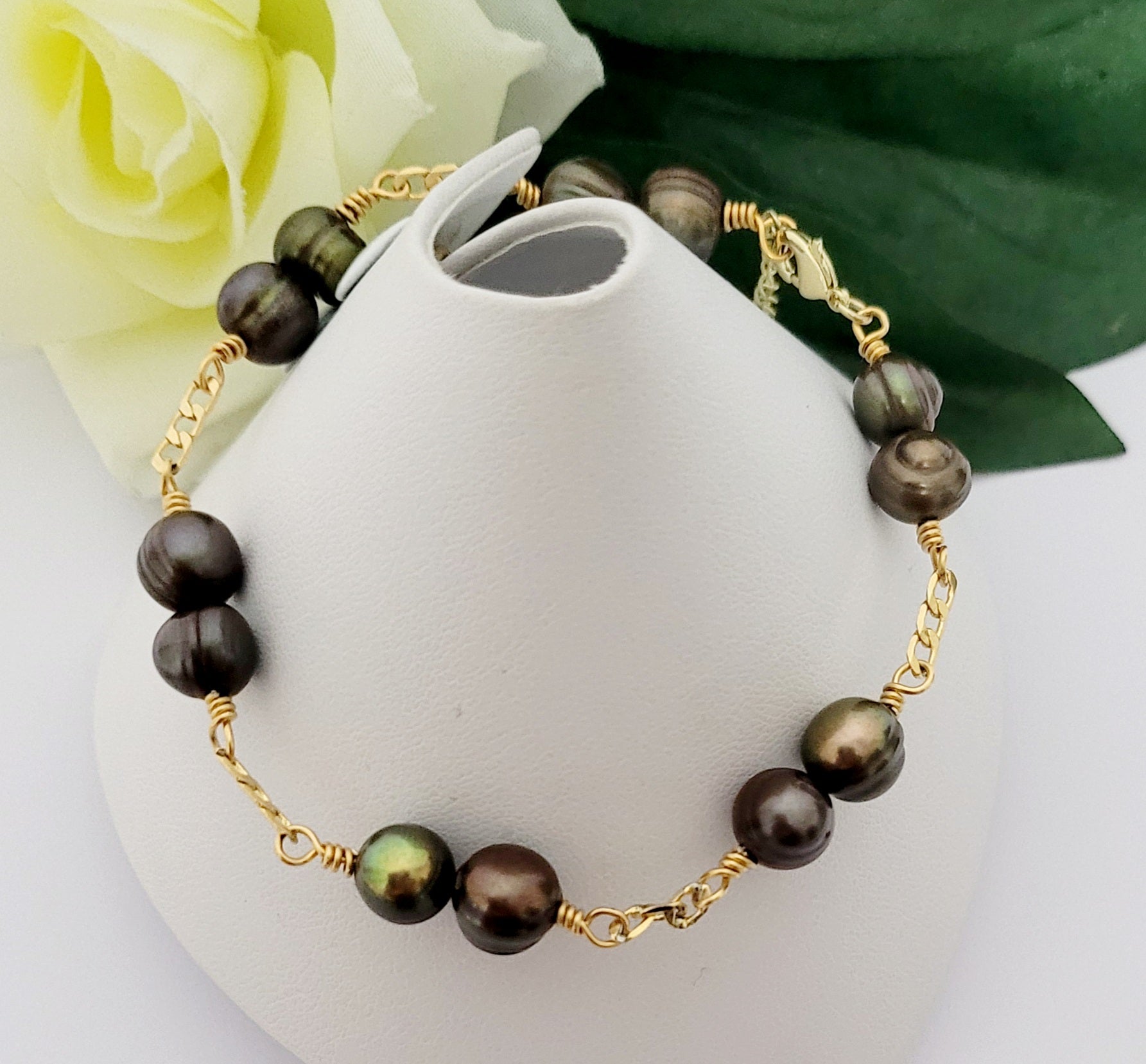 This simple elegant pearls bracelet is featuring the premium natural freshwater bronze green tone pearls and with a 14k gold filled Figaro link chain. The bracelet can be worn everyday, everywhere in casual or formal occasions. It can be used as a special gift for her!