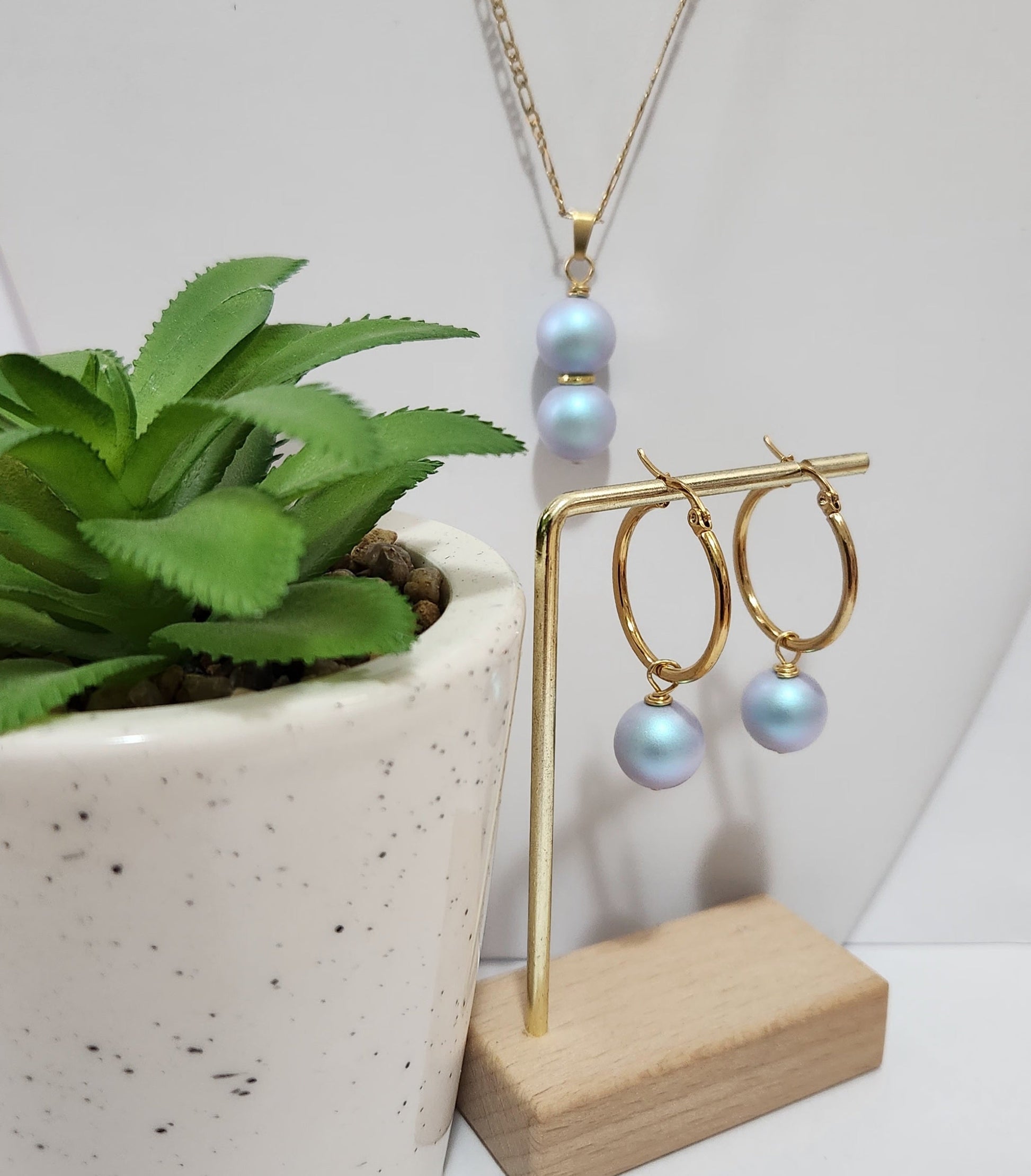 The set features a perfectly round blue Swarovski pearls, that is worn with gold-filled Figaro-style gold chain and hoop earrings. It can be worn with any outfit, to any function and everyday.