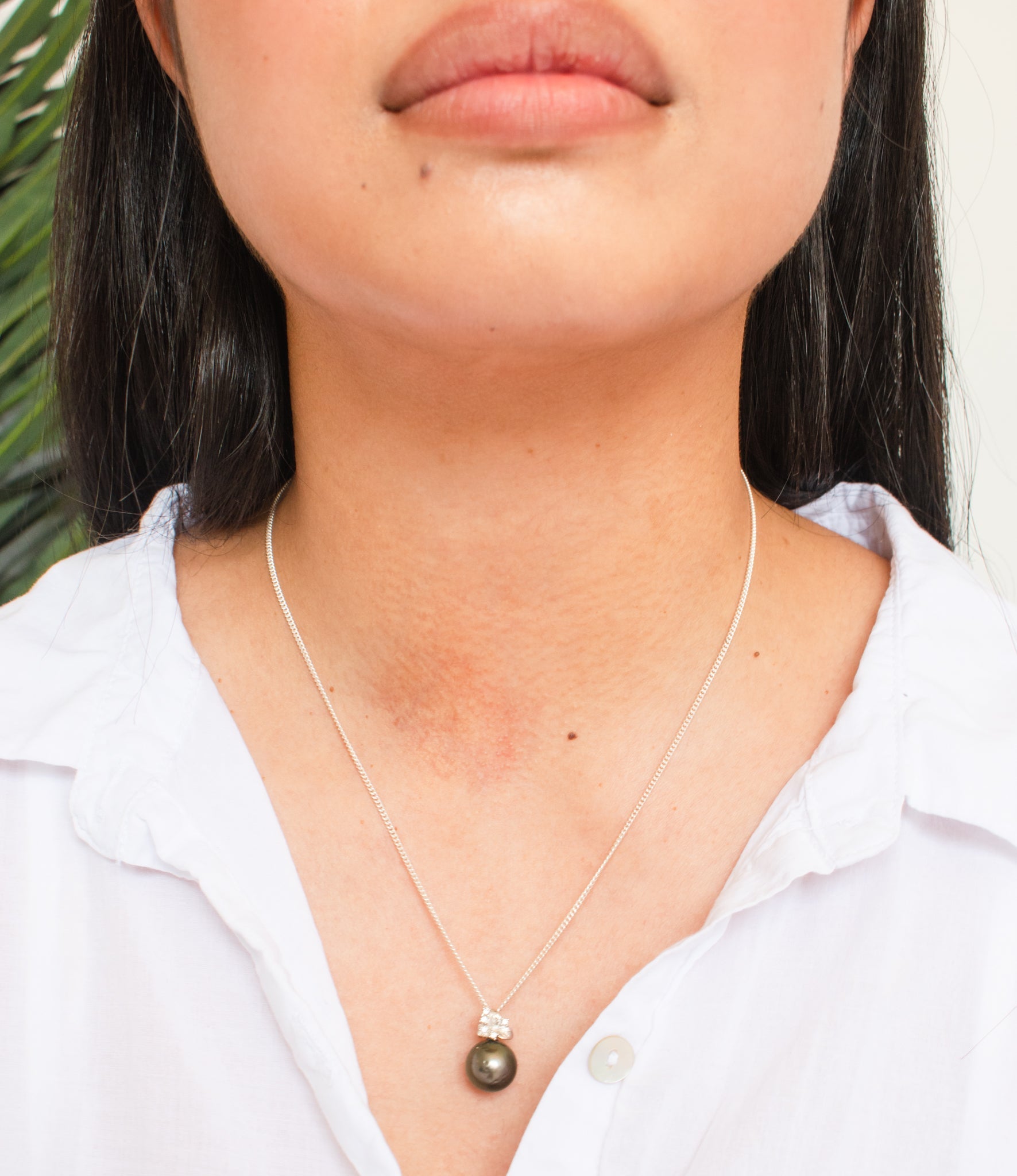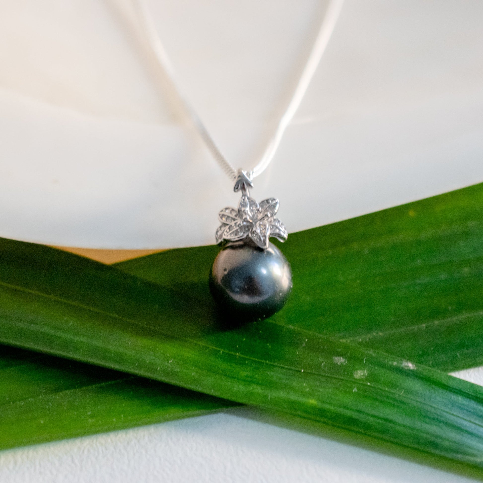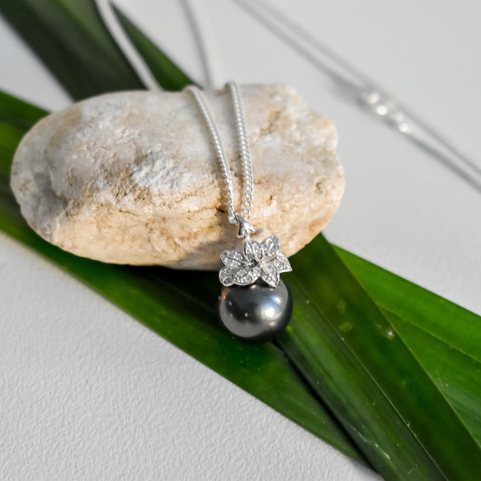 Introducing our exclusive sterling silver collection, featuring a natural Tahitian A+ grade pendant, perfectly round with a bespoke floral pendant in 925 genuine sterling silver and chain. This makes the perfect gift idea for her, with a touch of tropical elegance.