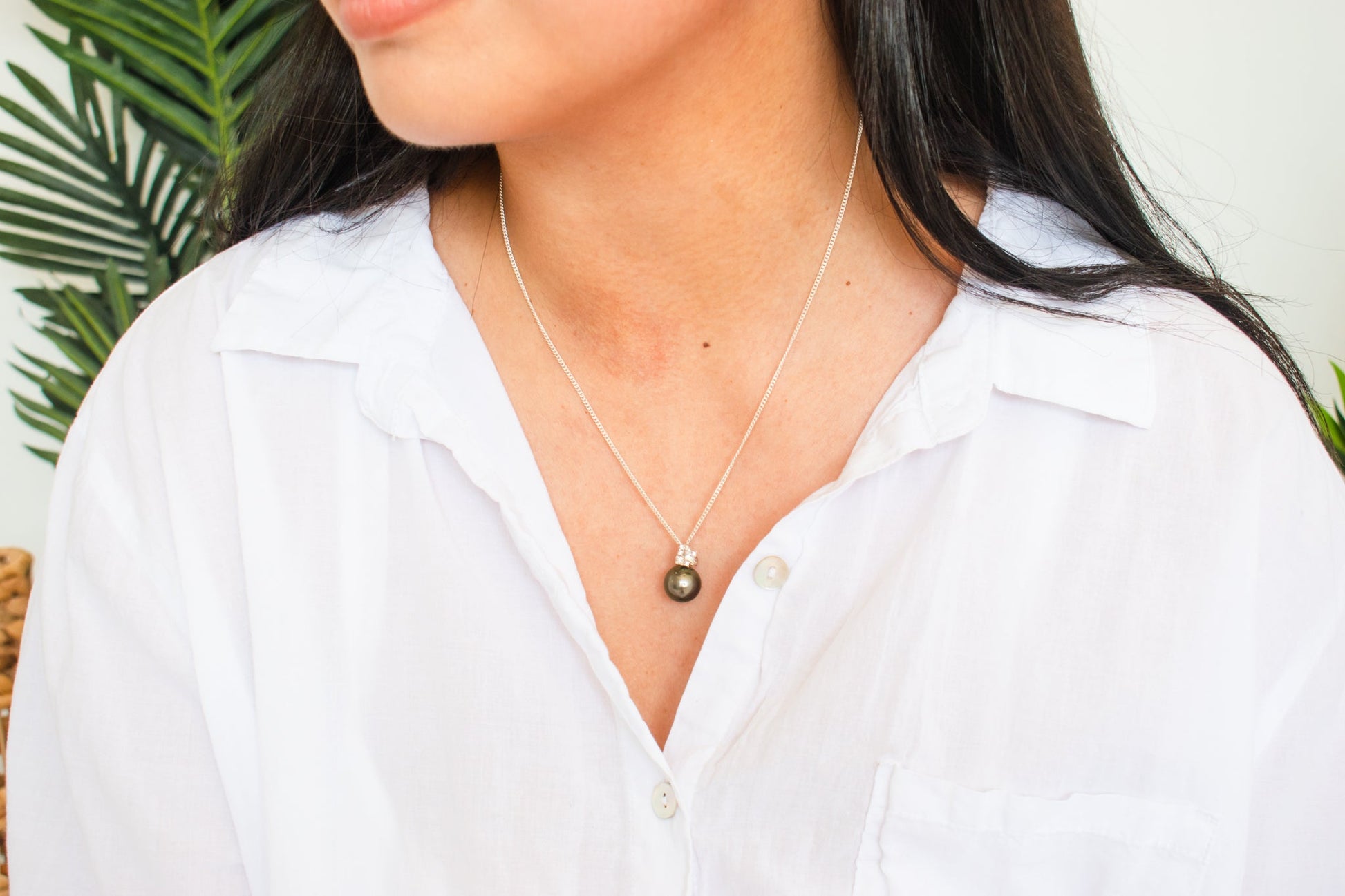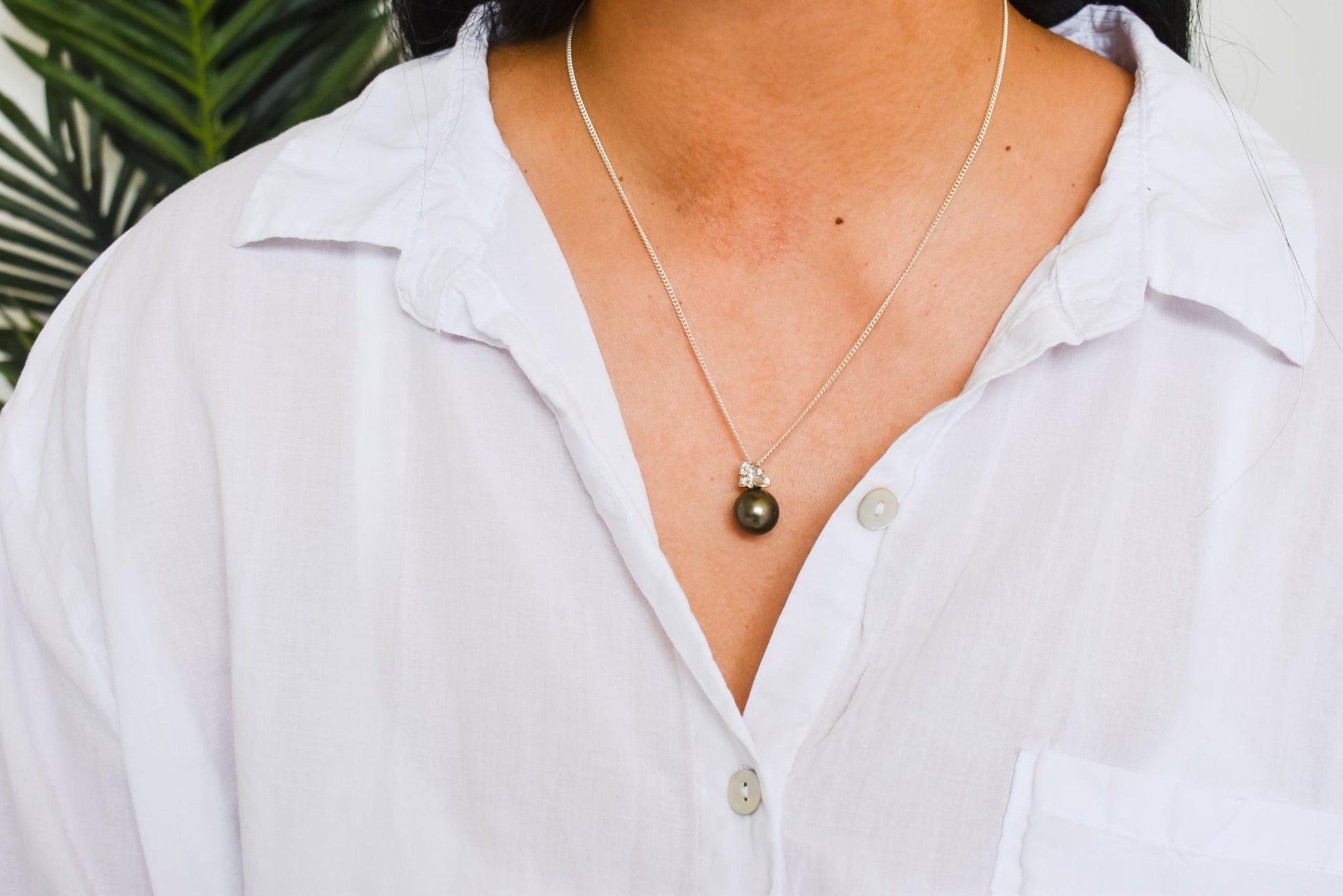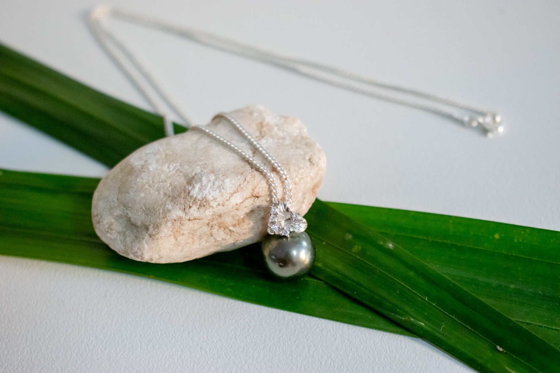 Introducing our exclusive sterling silver collection, featuring a natural Tahitian A+ grade pendant, perfectly round with a bespoke floral pendant in 925 genuine sterling silver and chain. This makes the perfect gift idea for her, with a touch of tropical elegance.