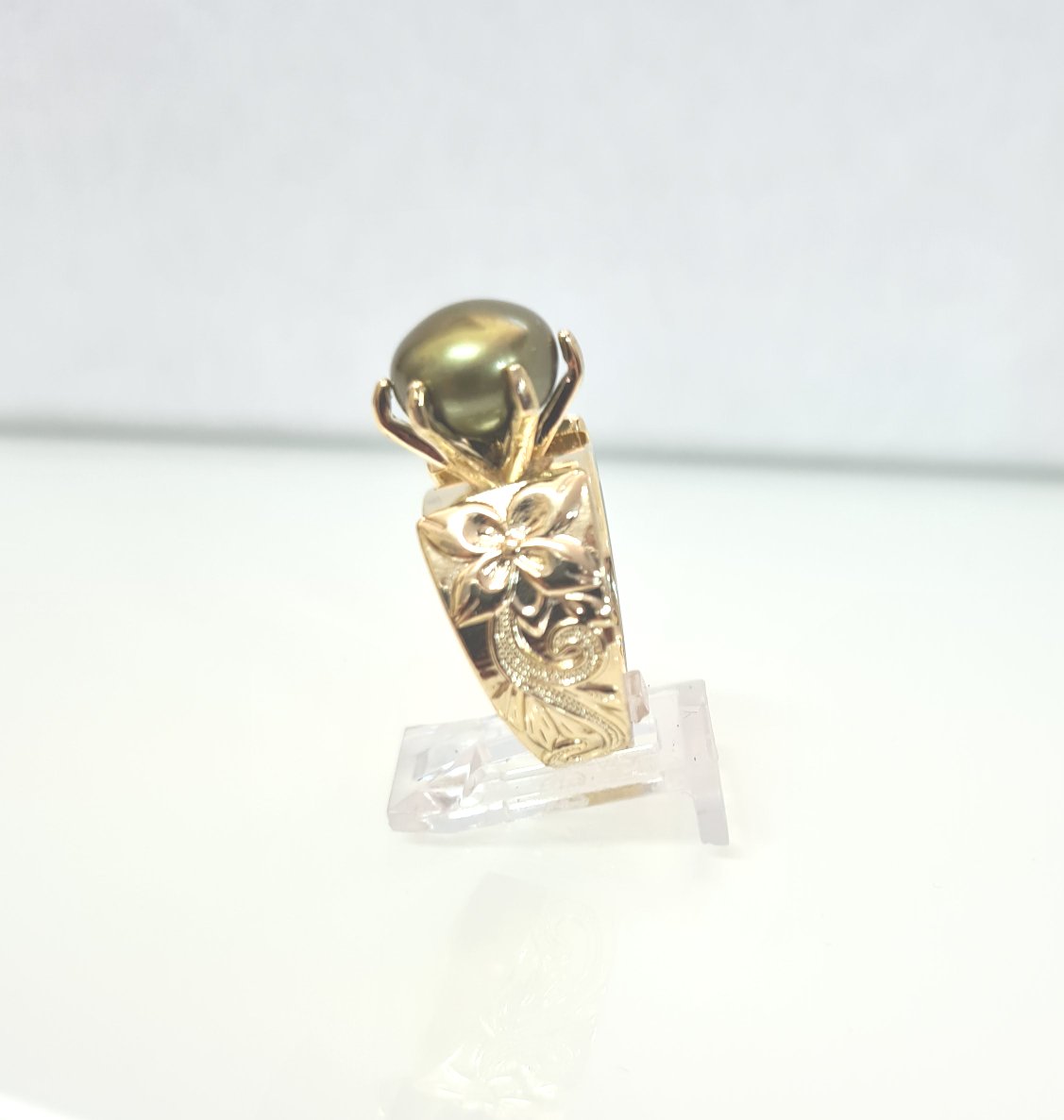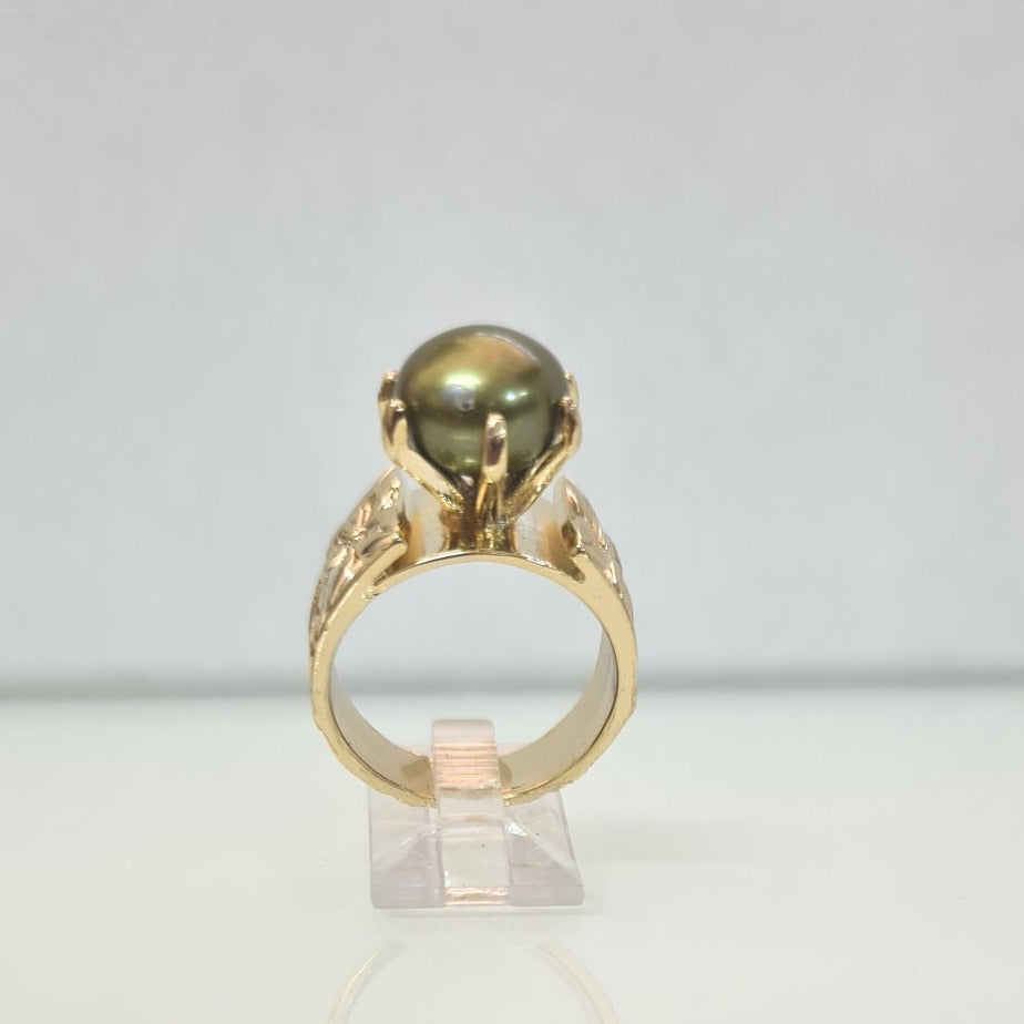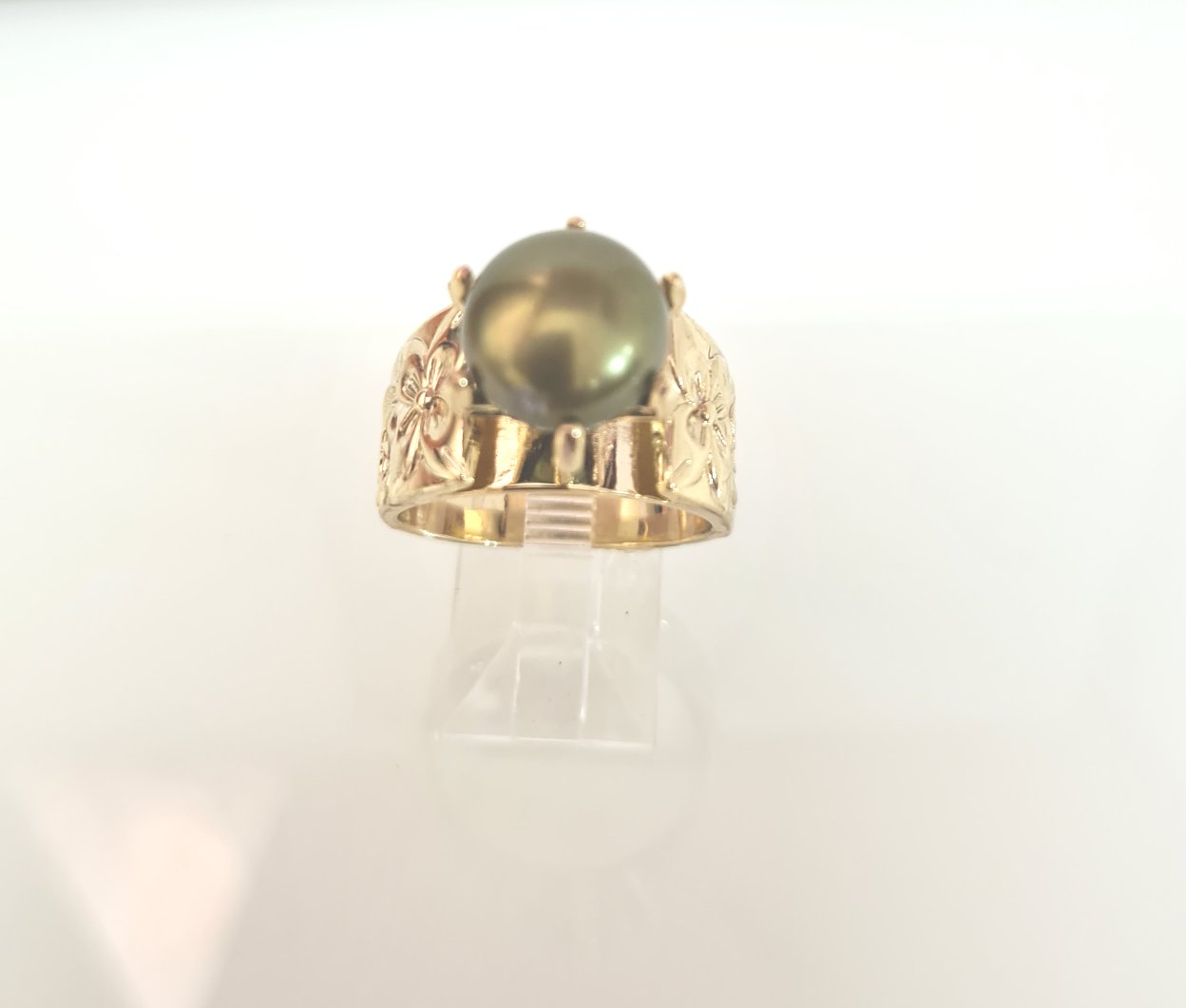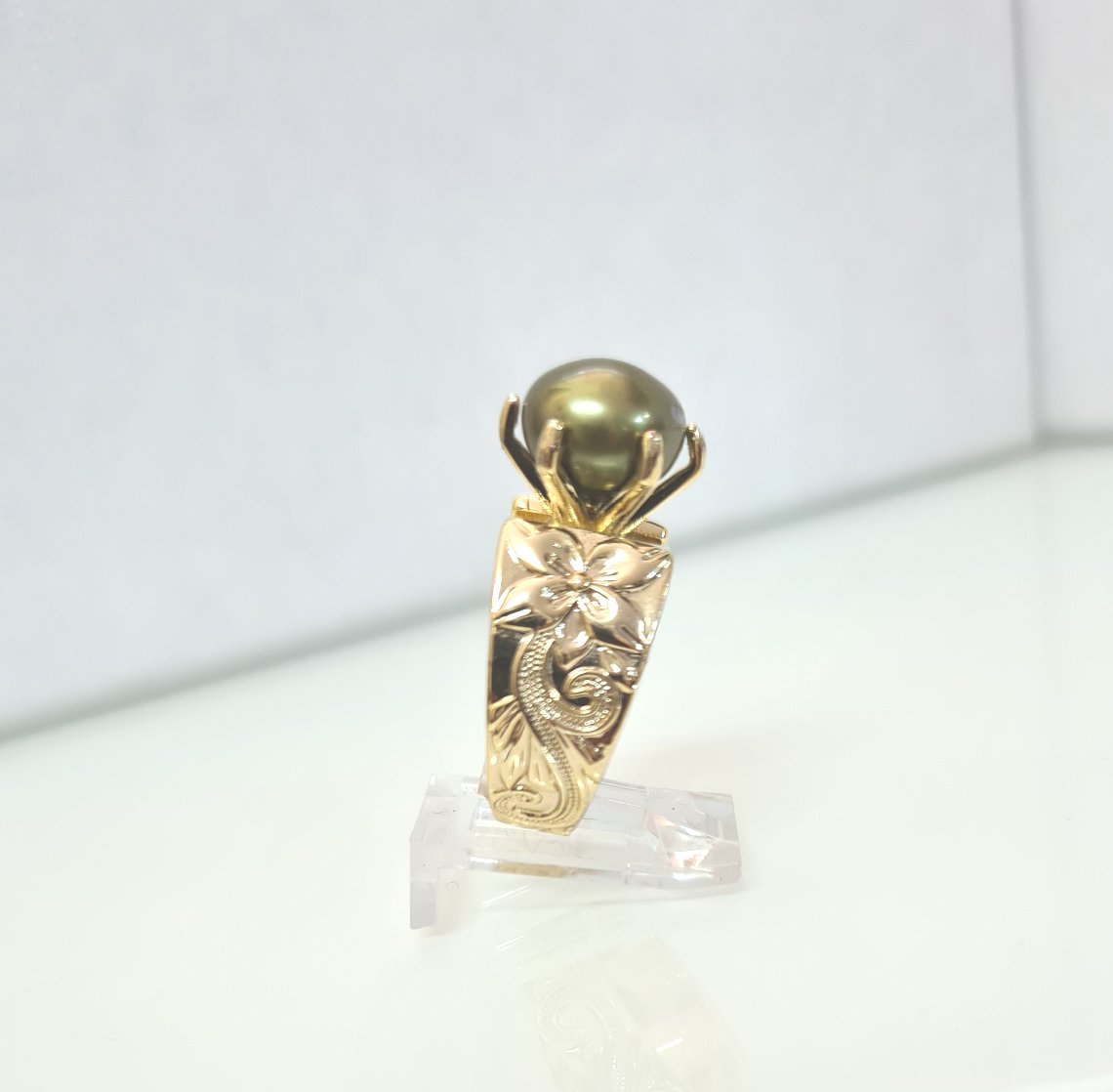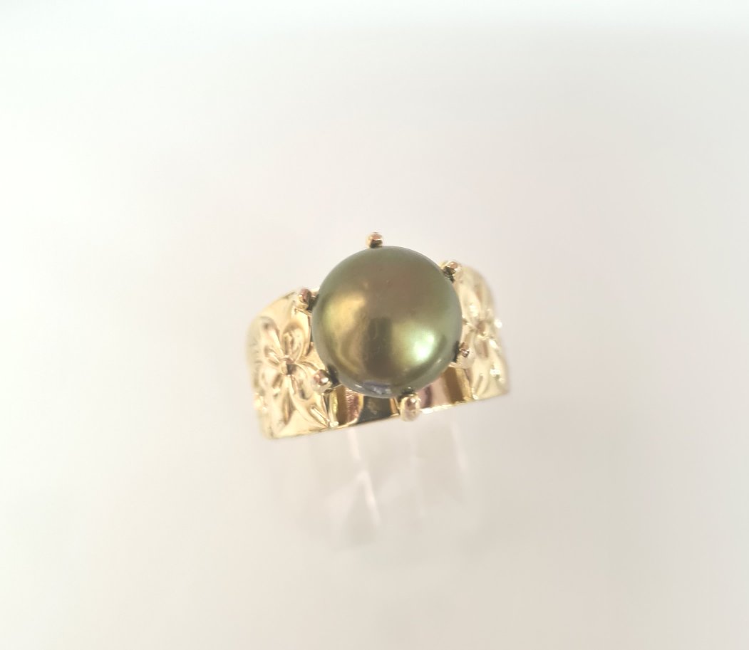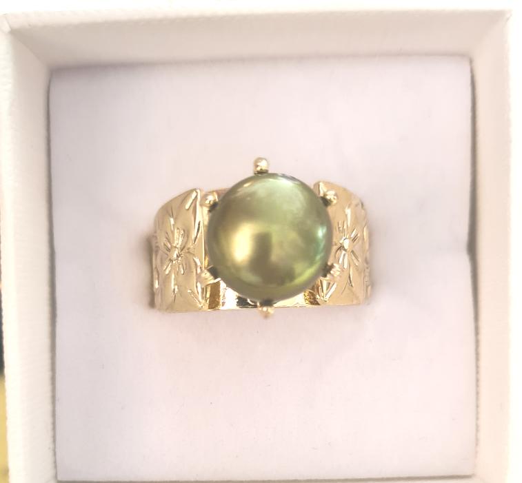 This Green Lady-Natural Pistachio Seawater Pearl was mounted beautifully on its crown onnthis floral band ring