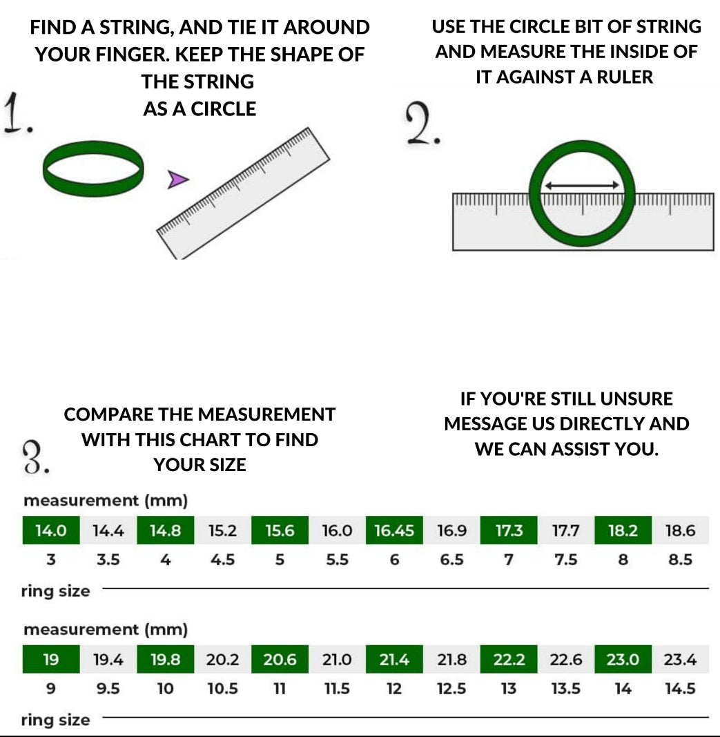 Sizing: If you are not sure about your size, we kindly ask to follow the image above to measure your finger, and use the measurement chart to see your size.