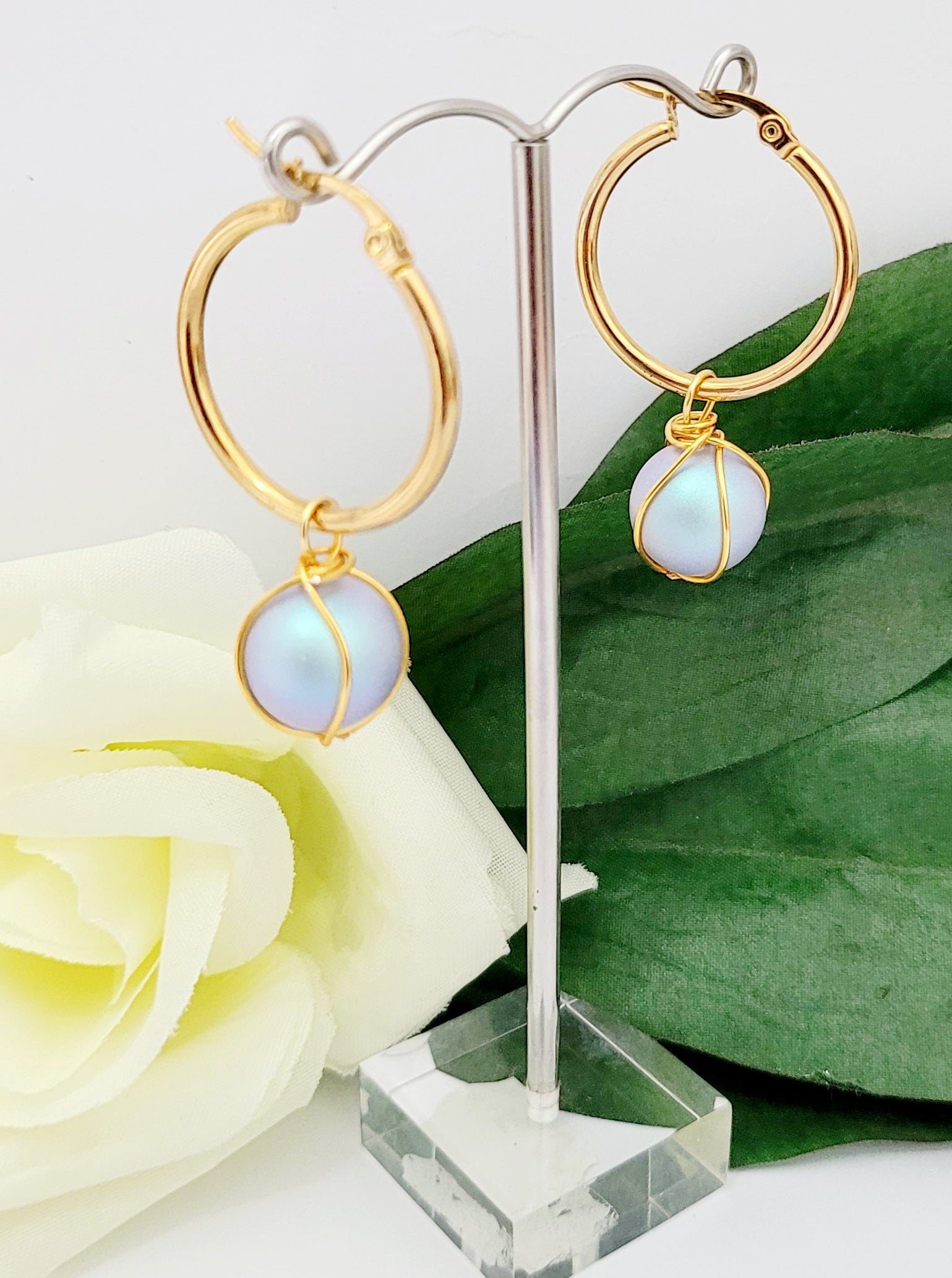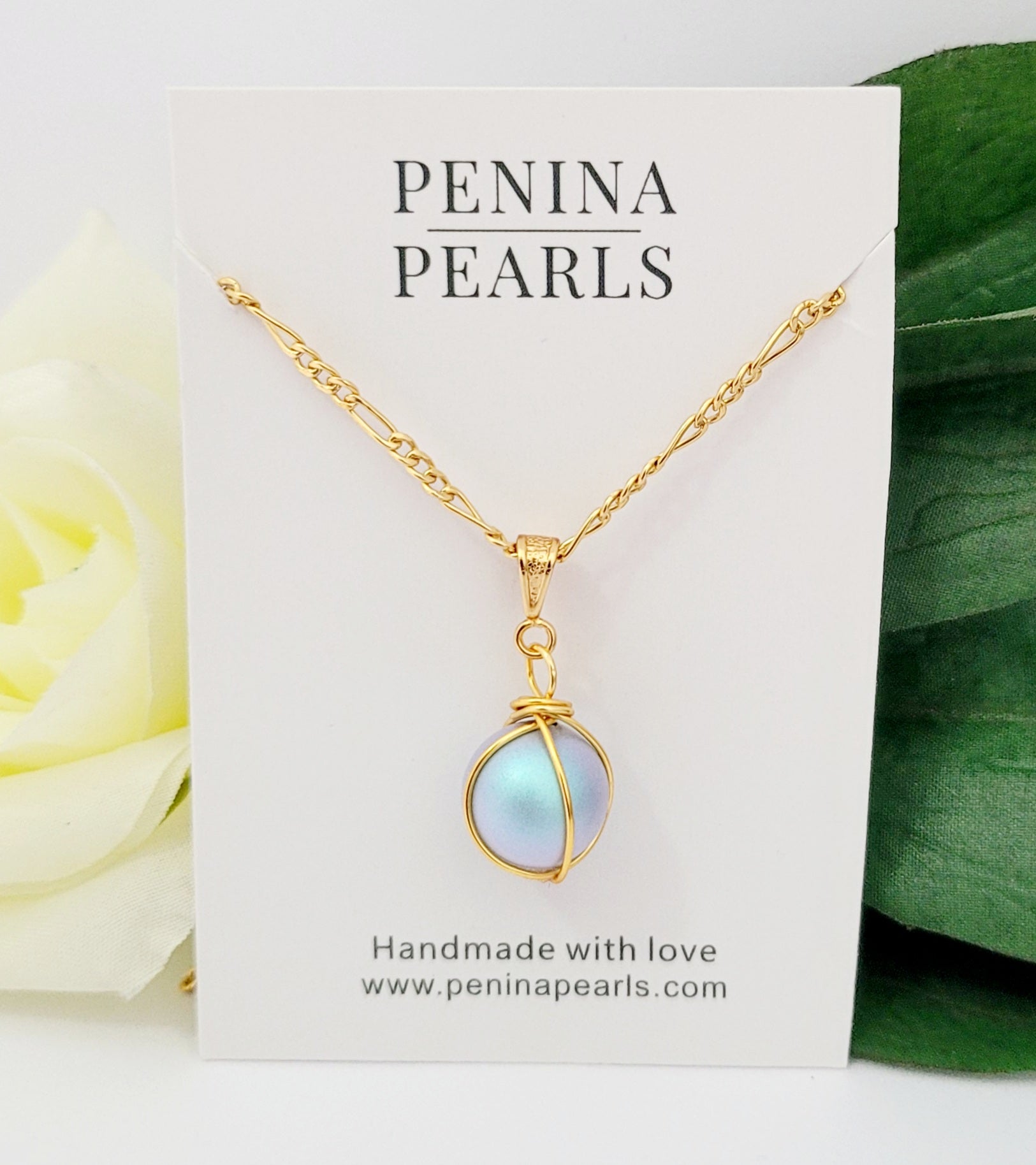 - Premium Swarovski pearls, iridescent light blue color, round shape, and 12mm in size.