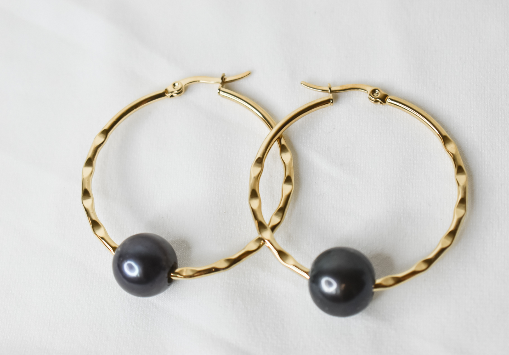 A timeless classic piece for your jewelry wardrobe, Layla pearl hoop earrings feature smooth genuine black pearls and high-quality 14k goldfilled hammered hoop earrings. Simple and perfect gift idea for her.