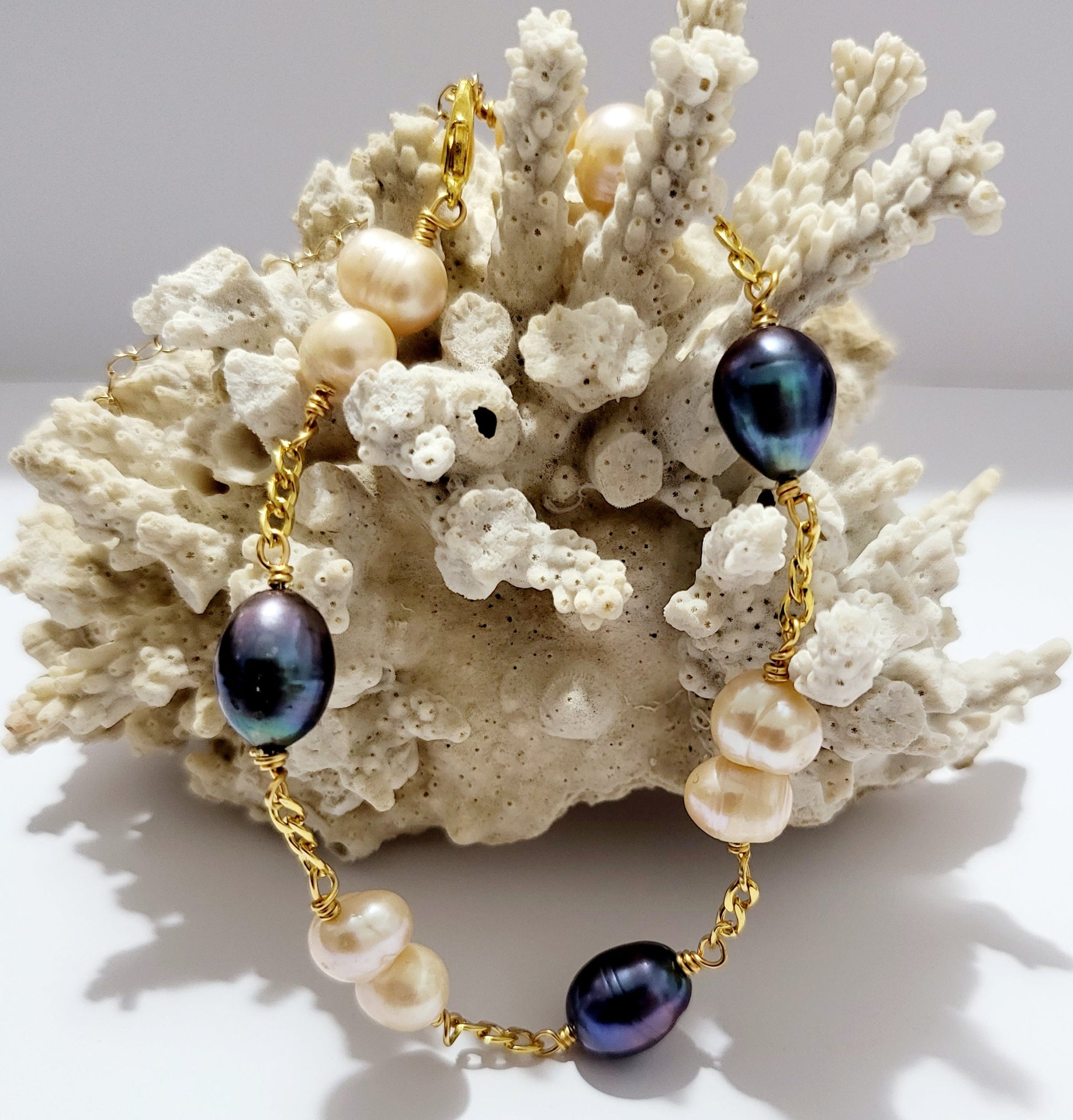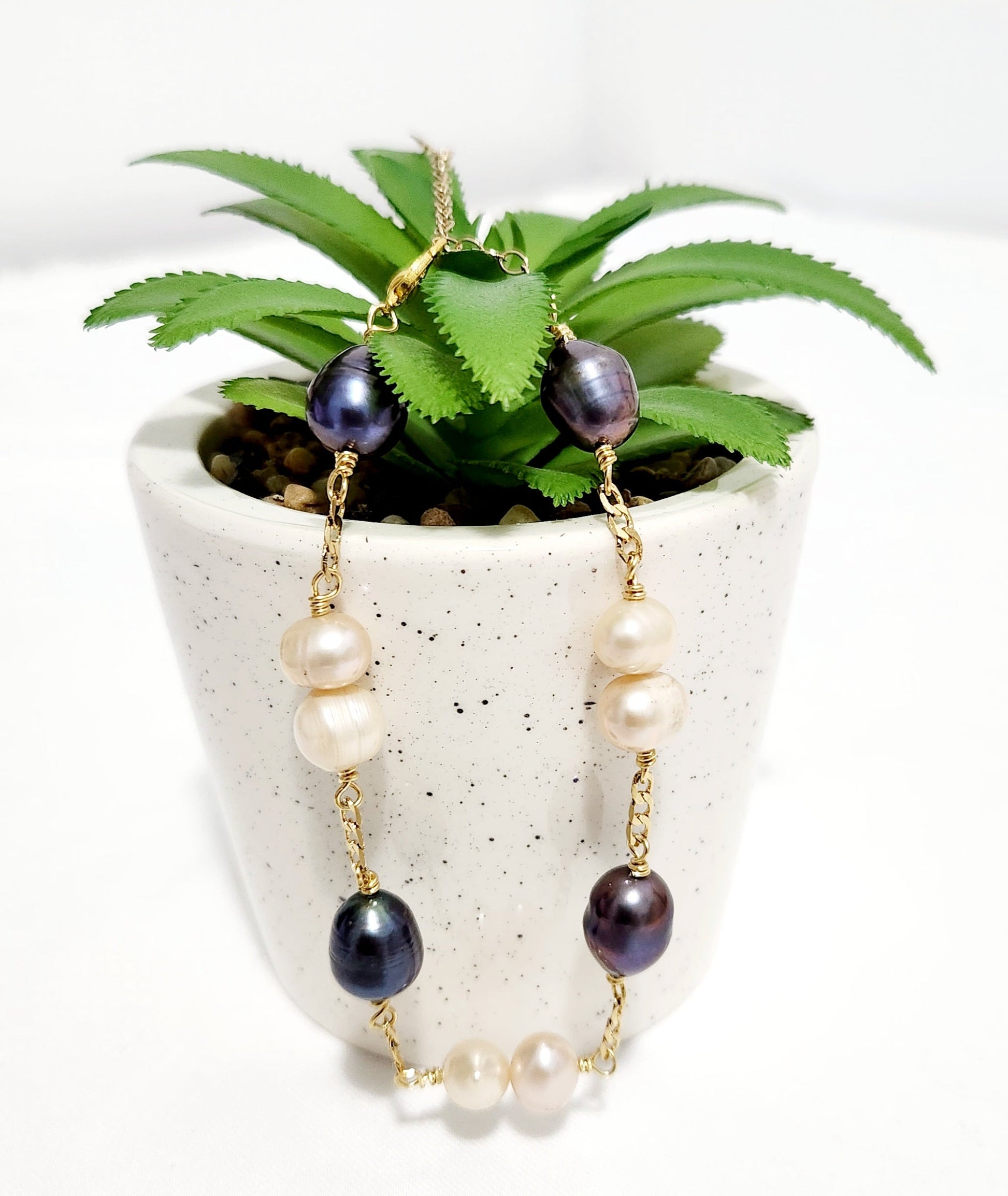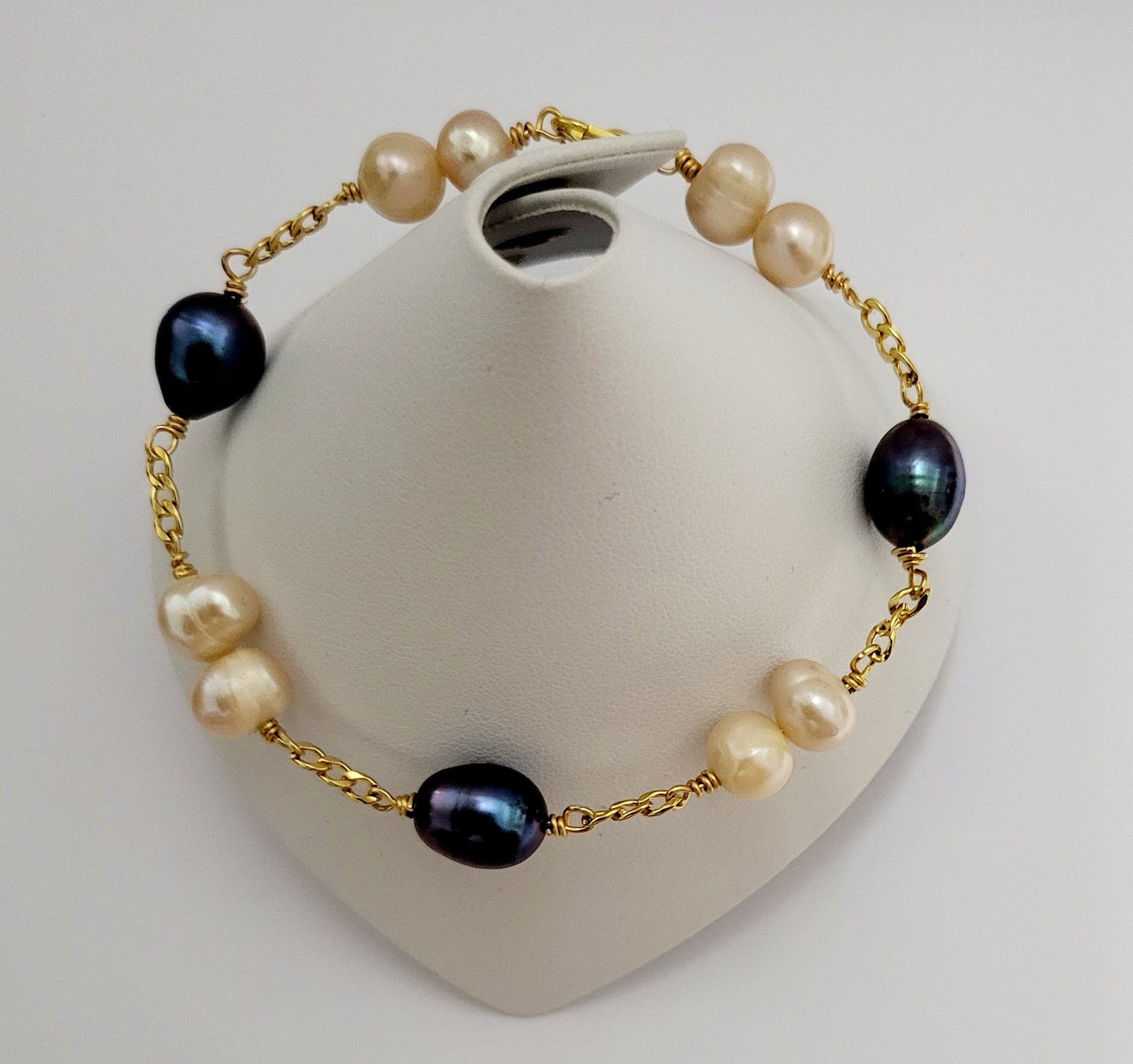 This bracelet features round 12mm black Tahitian blenidng with duo white freshwater pearls that make an elegant statement piece. This bracelet will be perfect for special events, dates and other special occasions.