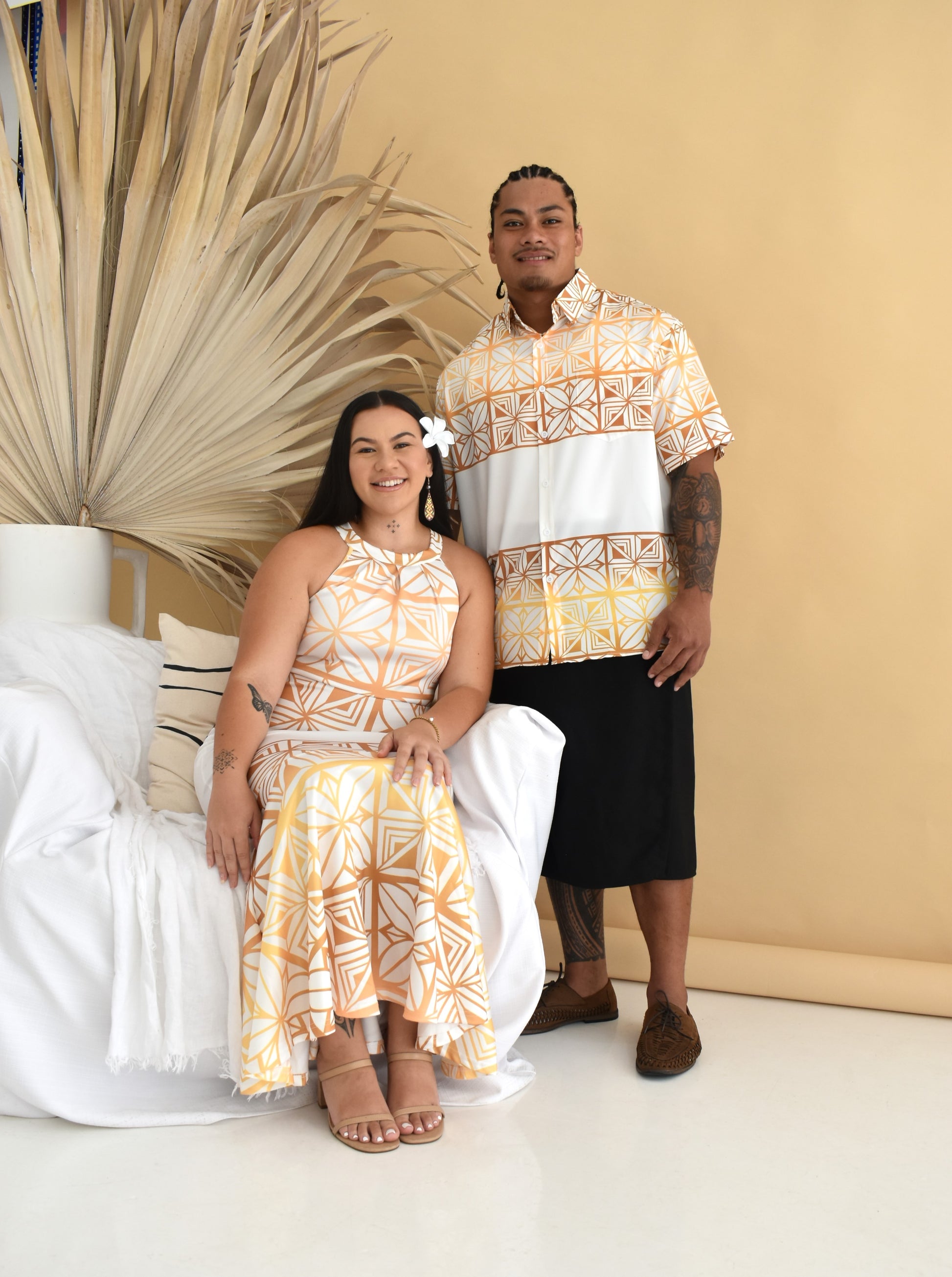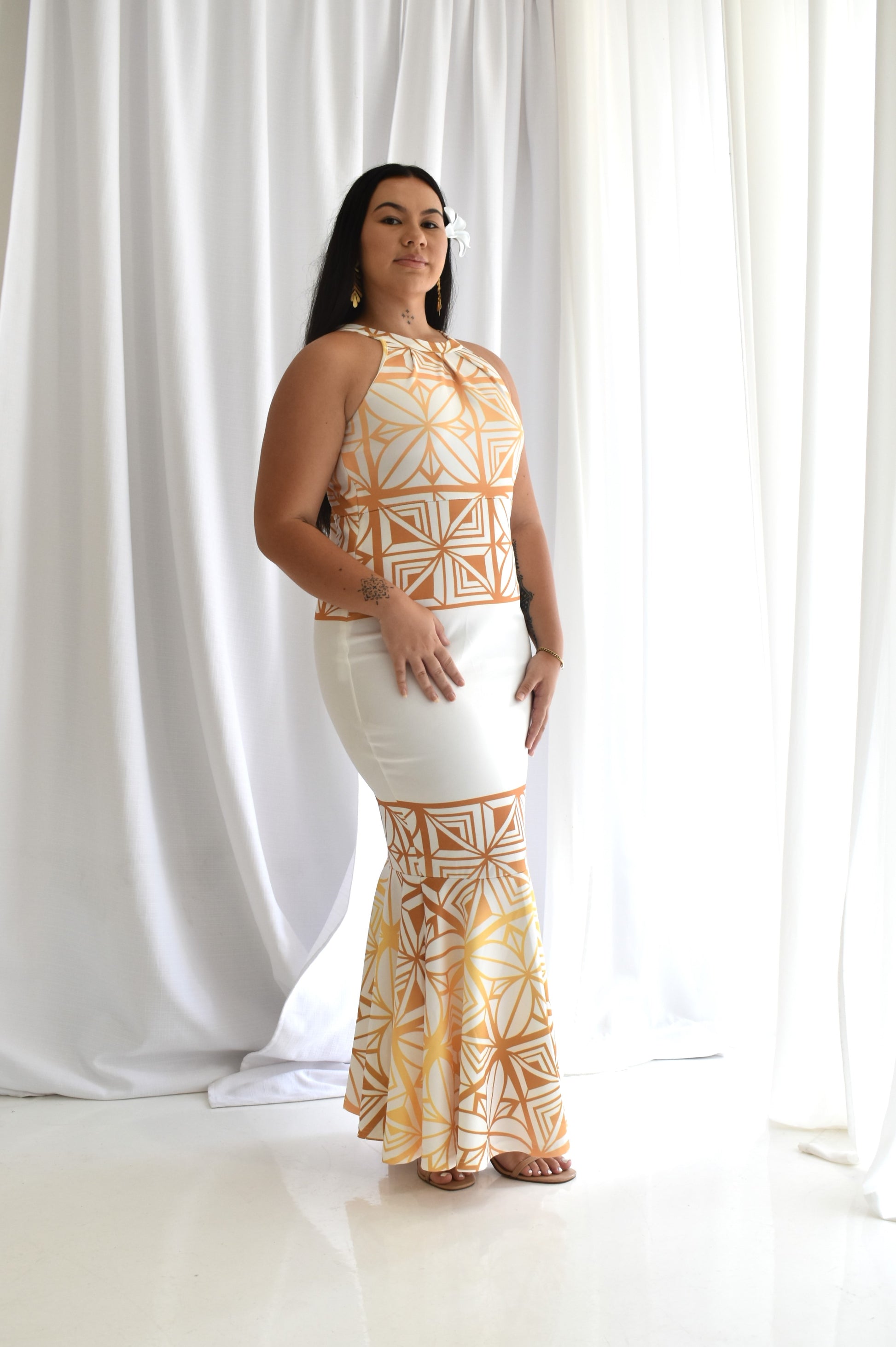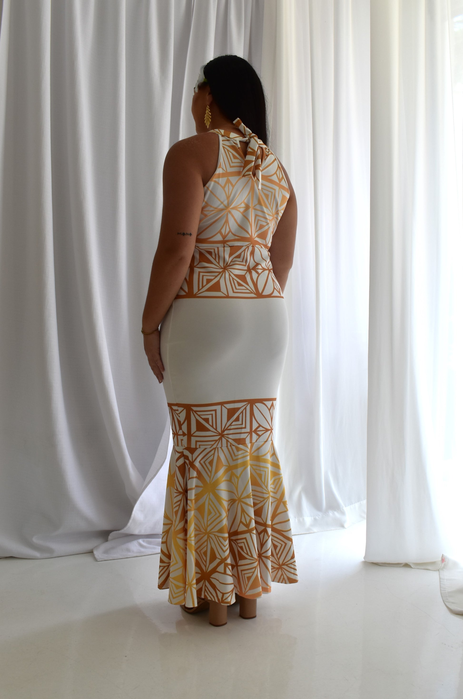 This show-stopper of a dress embraces the vibrant colours of the Pacific. Sisilia dress, with pasefika motifs all over and embraces the diversified beauty of the Pacific islands. With a classy halter neck, maxi length with a flare - this is the ultimate island dress for any island girl.