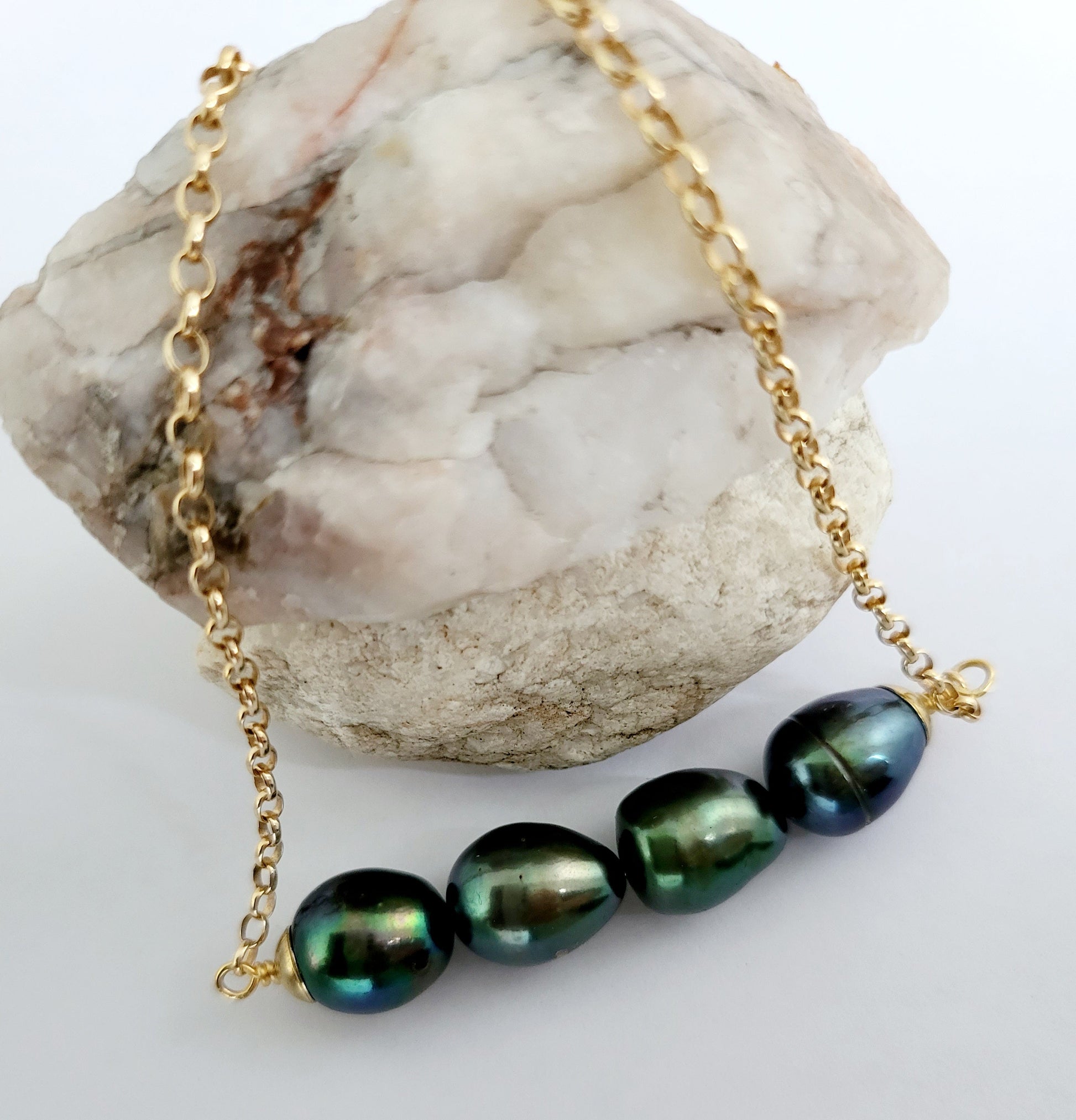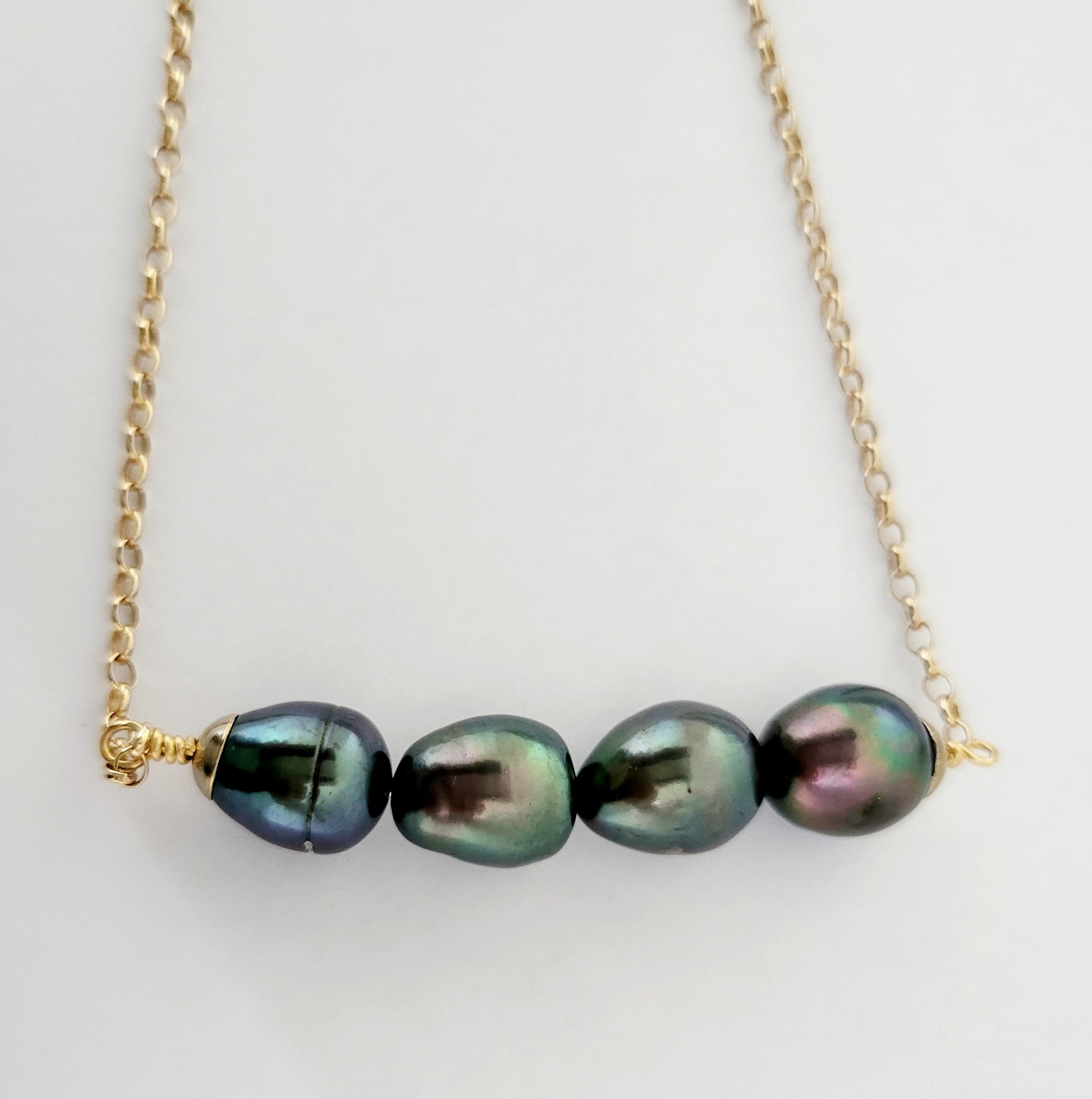 Featuring a one of a kind and unique green/black tone Authentic Tahitian pearls pendant hanging beautifully and attached to a solid 9crts solid gold chain with a 375 Italy stamped. It is a best gift for her or as a special treat for you.
