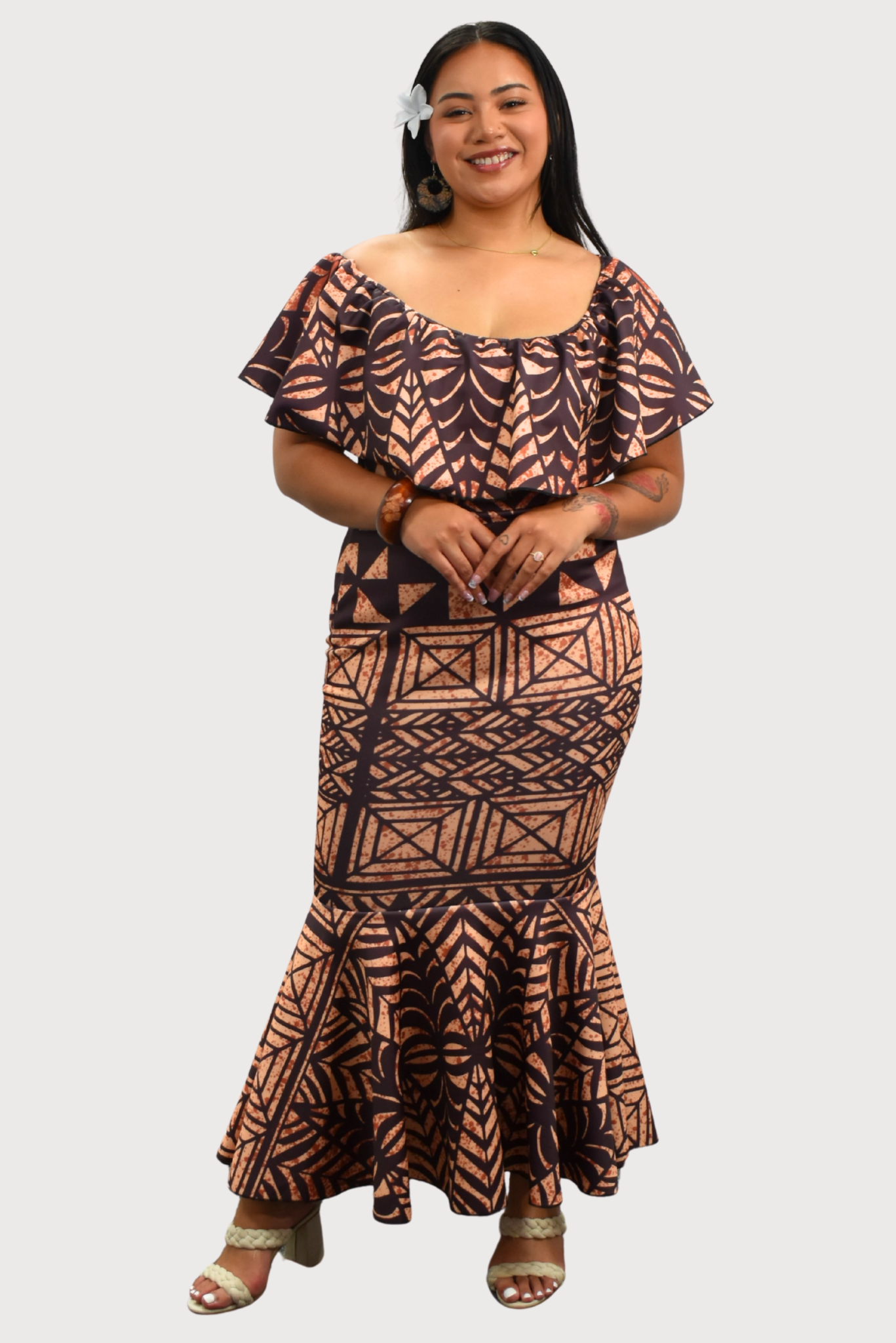 DRESS - OFF SHOULDER FRILL MAXI - BROWN