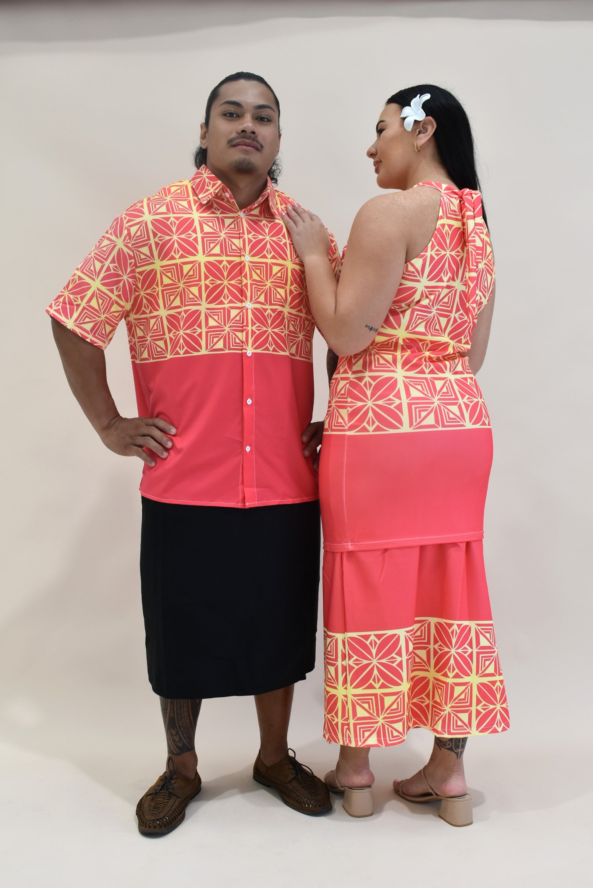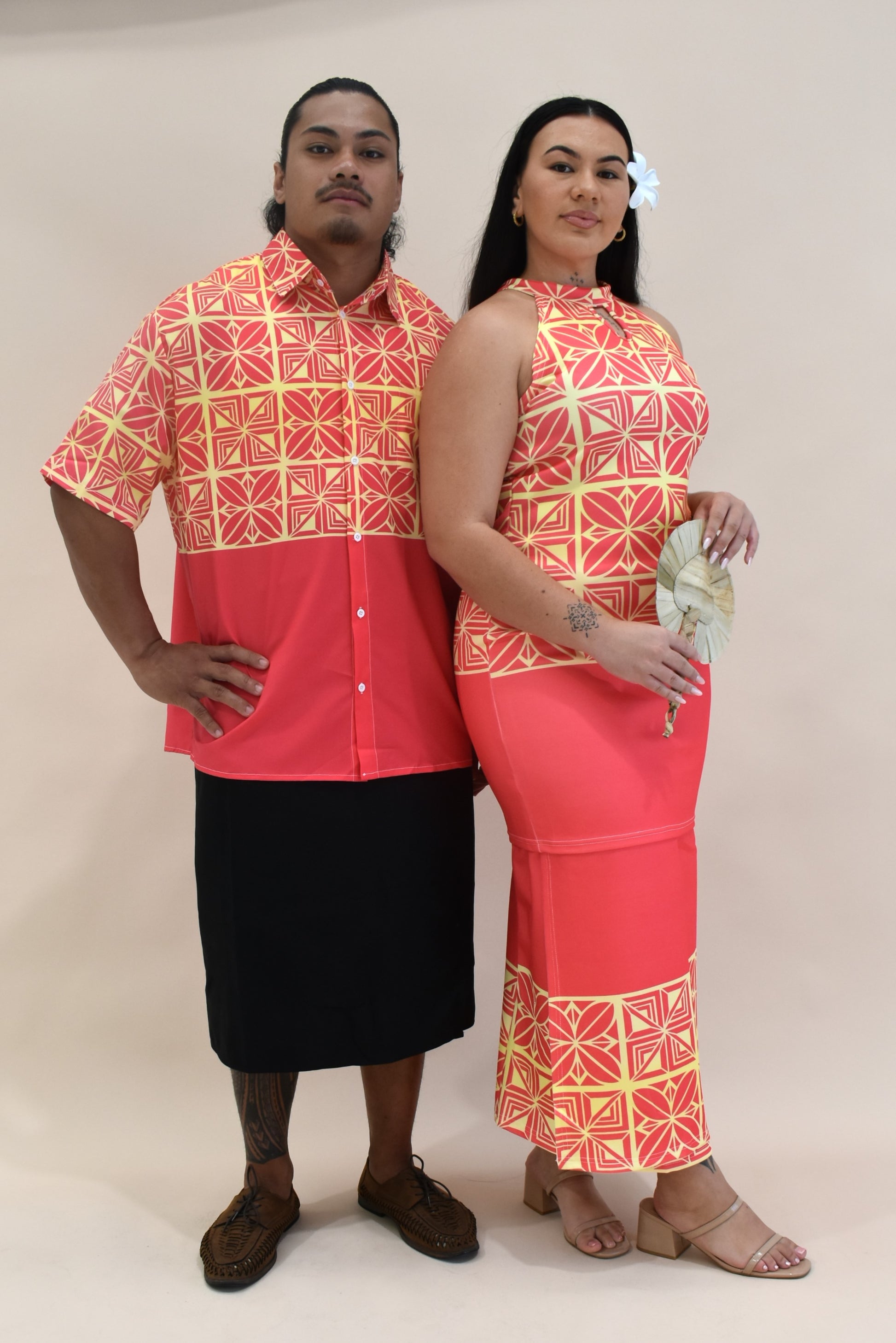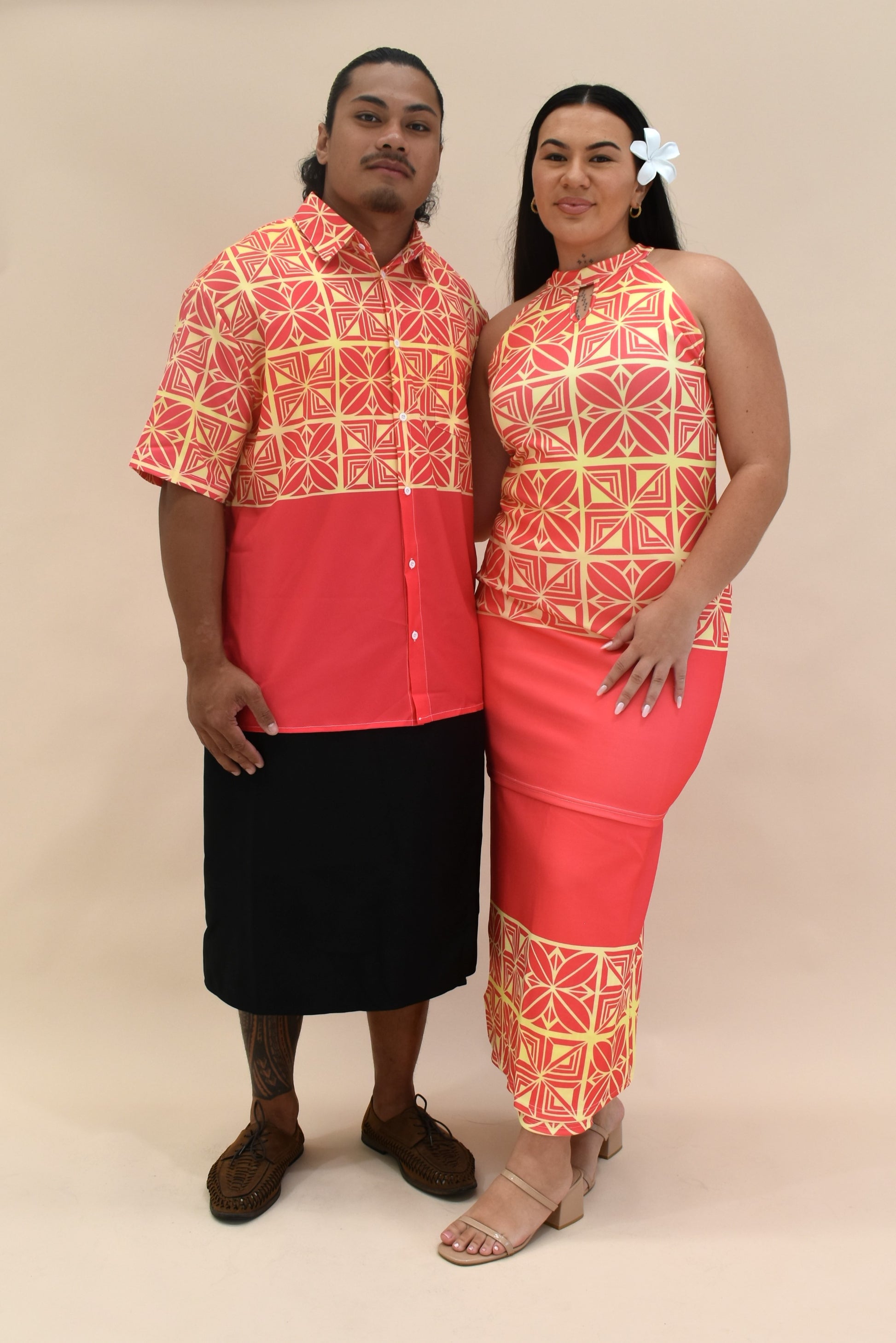 Ready for your next event. Now available to match with her in the HALTER NECK PULETASI - TWO PIECE OUTFIT - ORANGE & YELLOW
