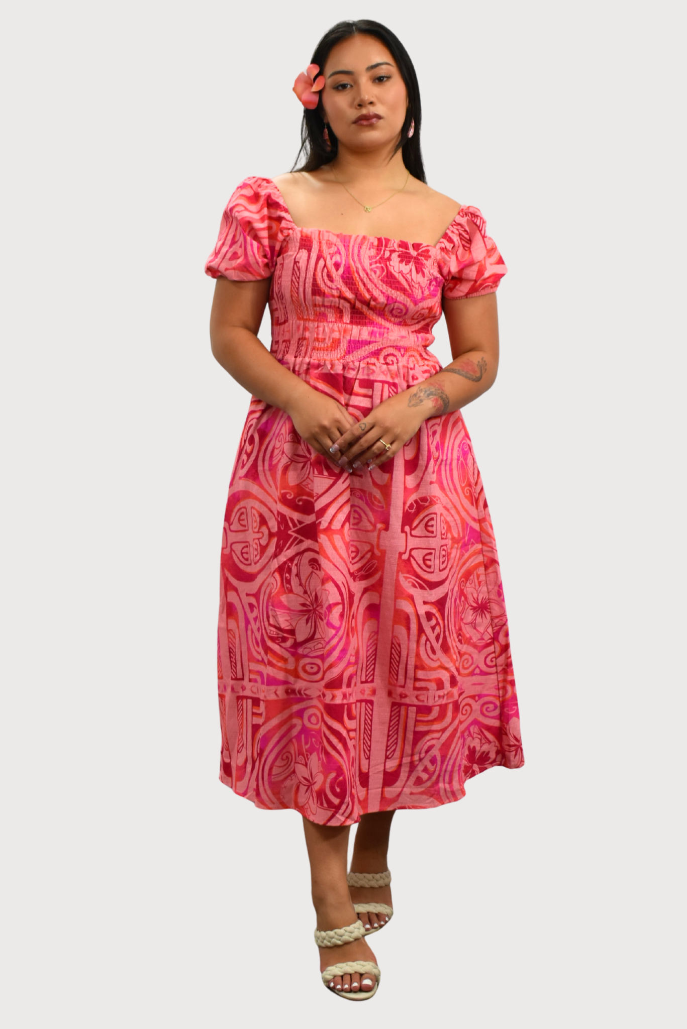 Embrace the essence of the Pacific with the Xenia dress, a stunning fusion of traditional island heritage and contemporary fashion. Designed for every woman, this dress blends cultural motifs with a chic, flattering silhouette. Perfect for all events.